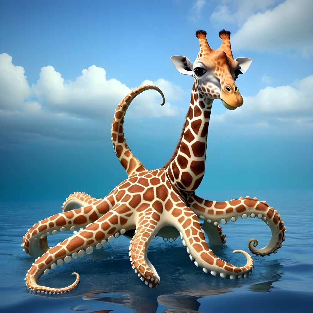 A whimsical hybrid creature combines a giraffe's body and patterns with octopus tentacles, gracefully emerging from tranquil blue waters under a clear sky. A surreal and playful scene.