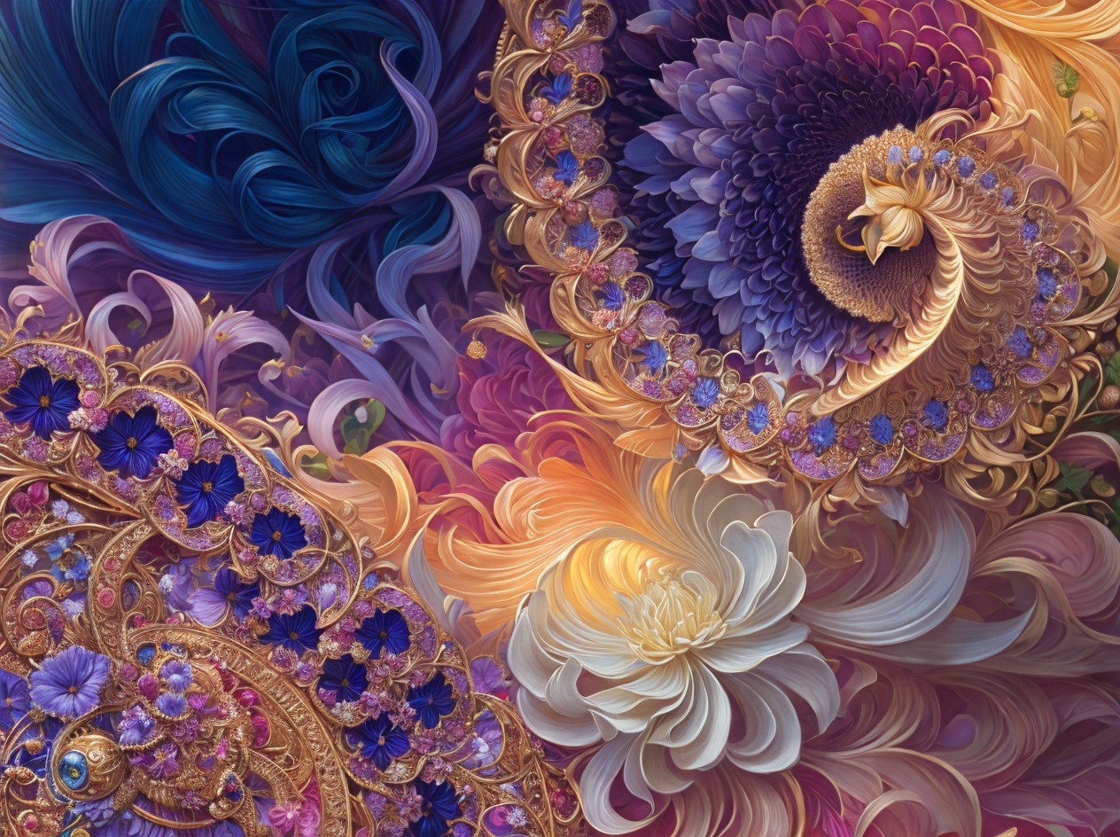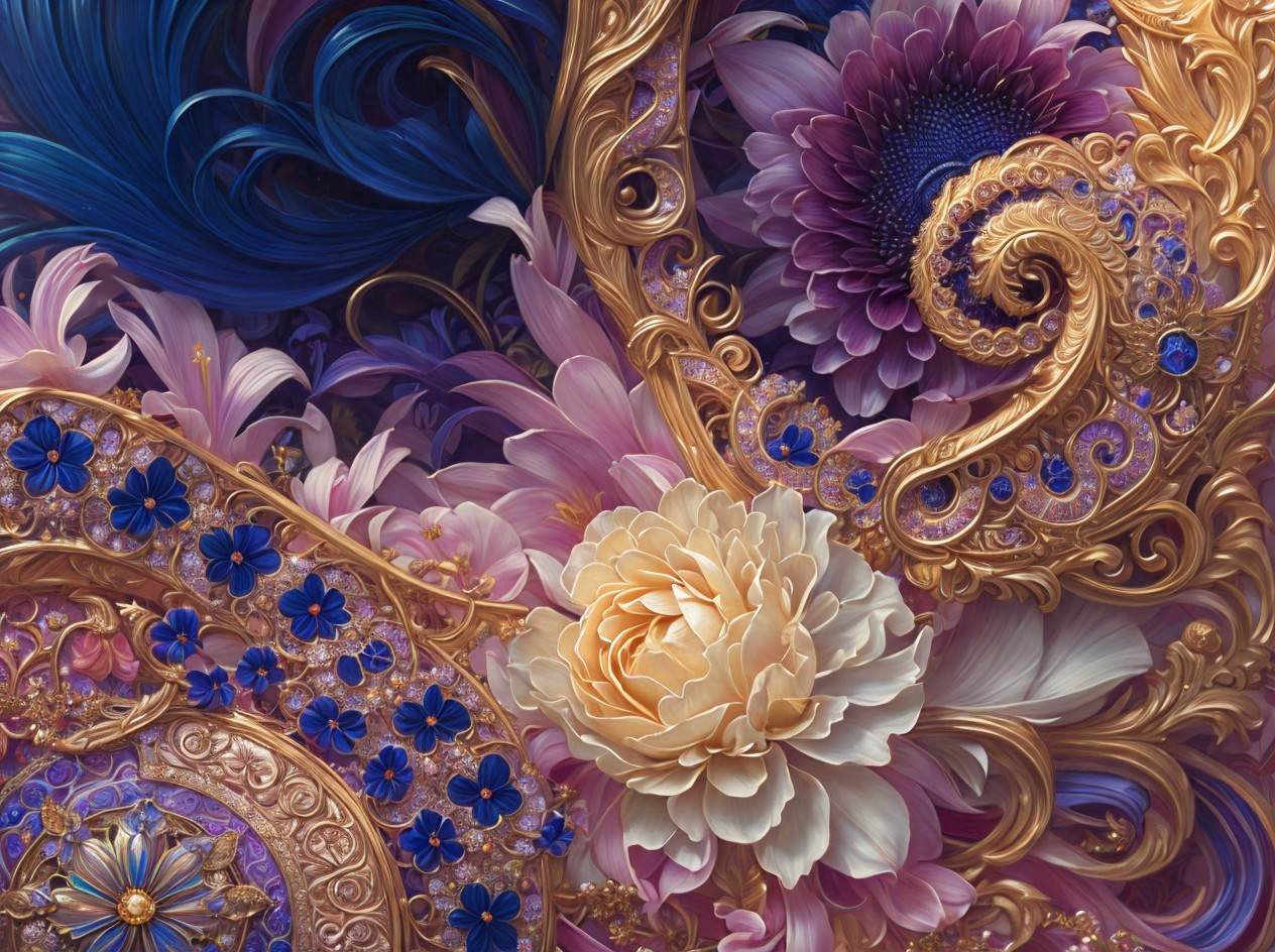 An ornate and colorful digital artwork featuring gold filigree designs, lush blue swirls, and detailed pink and peach flowers.
