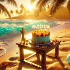 A vibrant beach scene at sunset features a colorful birthday cake on a wooden table, surrounded by tropical decorations, palm trees, and soft waves, creating a festive and serene atmosphere.
