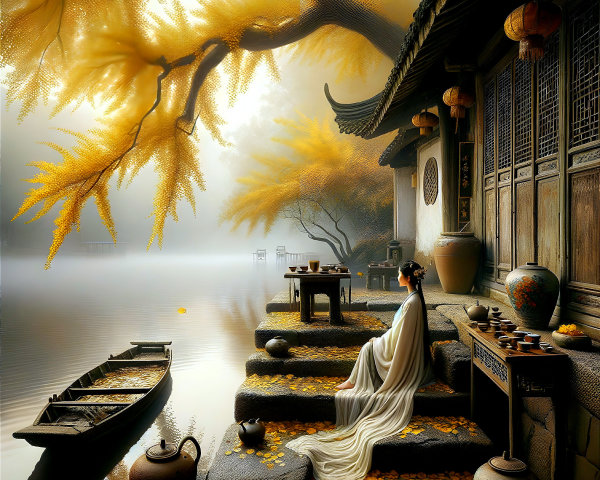 A vibrant, abstract depiction of a grand architectural structure, resembling a cathedral, surrounded by swirling colors and reflections on a tranquil waterway, evoking a dreamlike atmosphere.