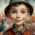 A cheerful girl with a straw hat and a bluebird perched on her finger smiles warmly amid vibrant flowers, radiating innocence and joy in a colorful, idyllic setting.