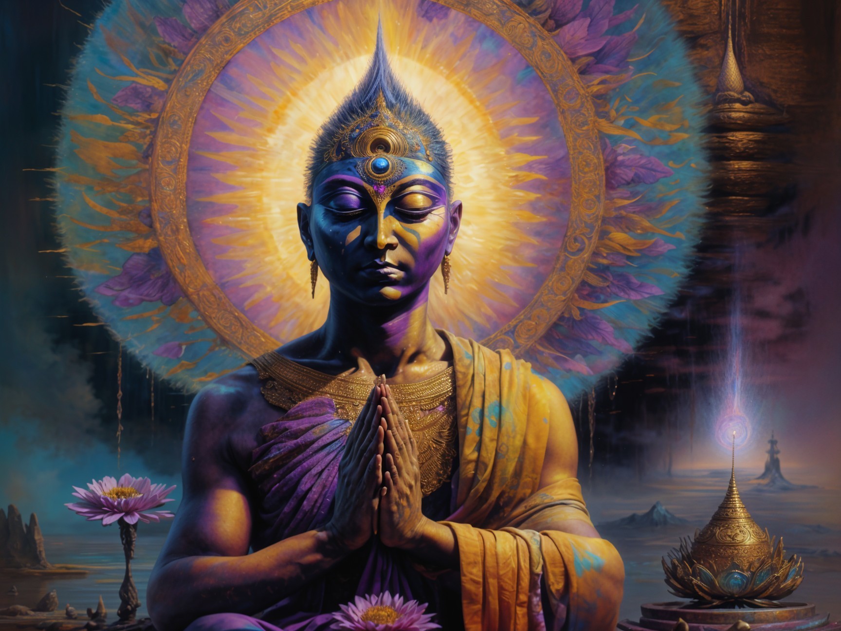 A radiant figure sits in meditation, adorned with intricate gold jewelry and a vibrant, ornate backdrop. The scene emanates tranquility, emphasizing spiritual depth and enlightenment.