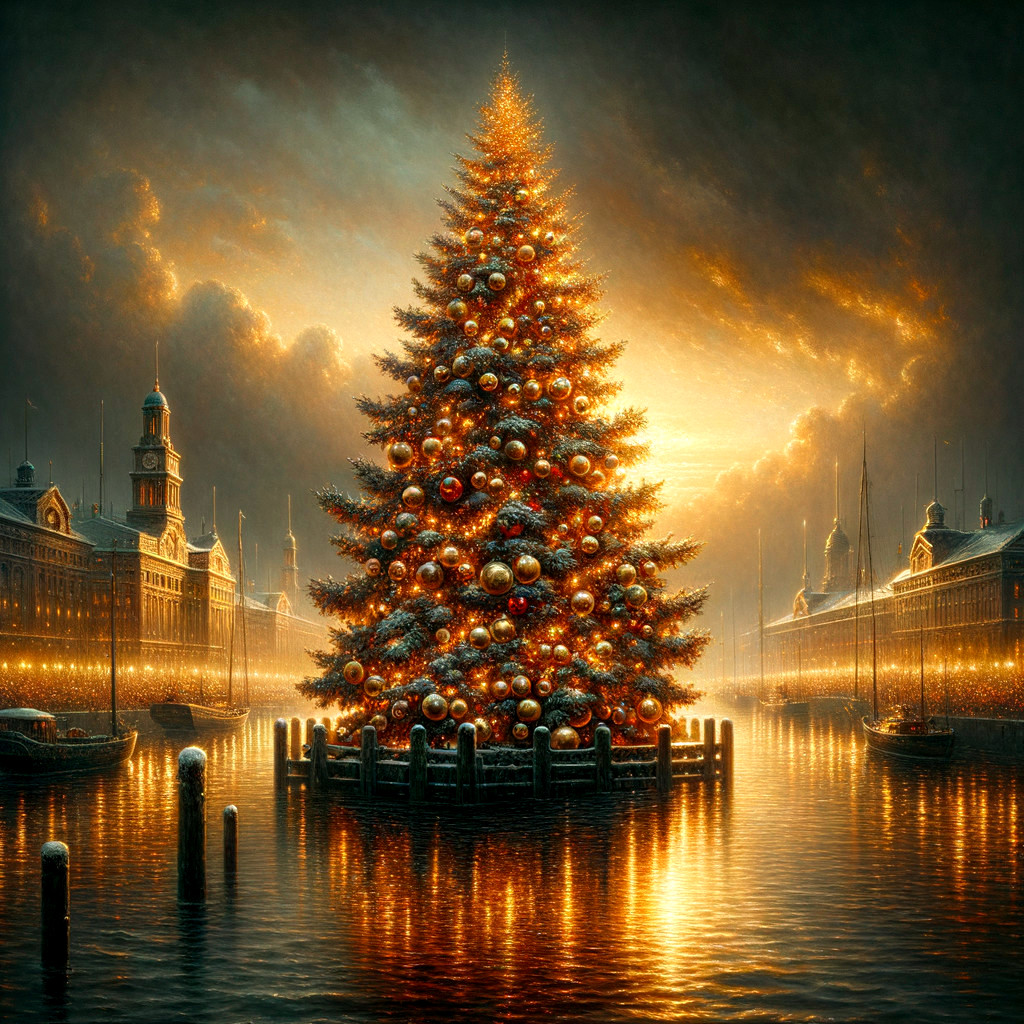 A magical Christmas tree with glowing ornaments and lights reflecting on the water, surrounded by city buildings and boats under a dramatic glowing orange and dark sky.