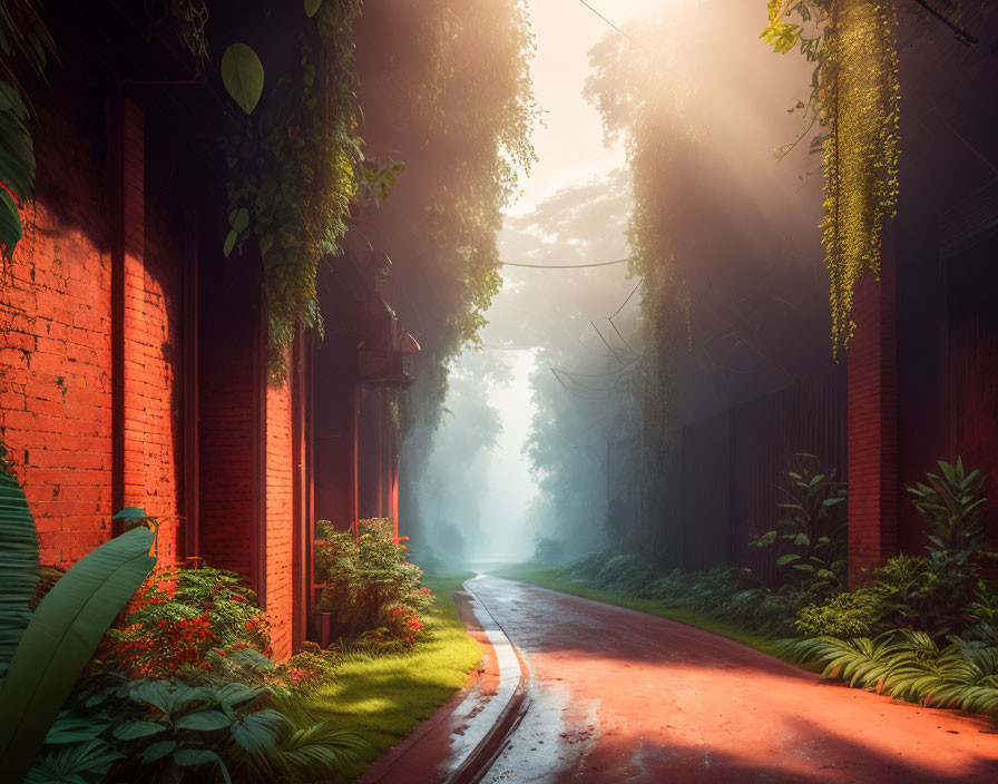 Prompt: "A small road between factory high walls done with Red bricks covered by roots, tropical vegetation overgrown coming out of windows, sunrays coming through the canopy, foggy misty haze"