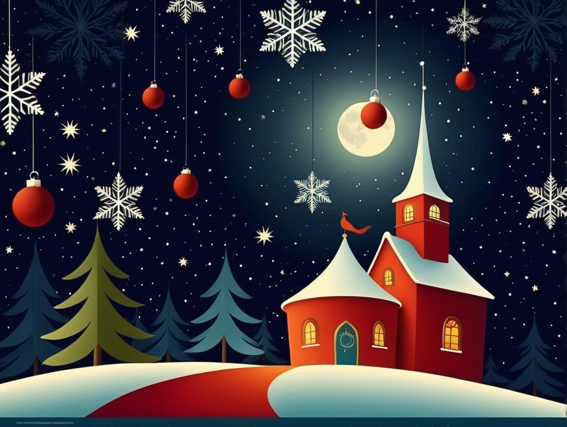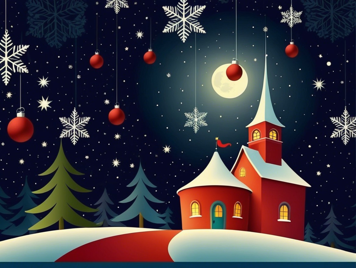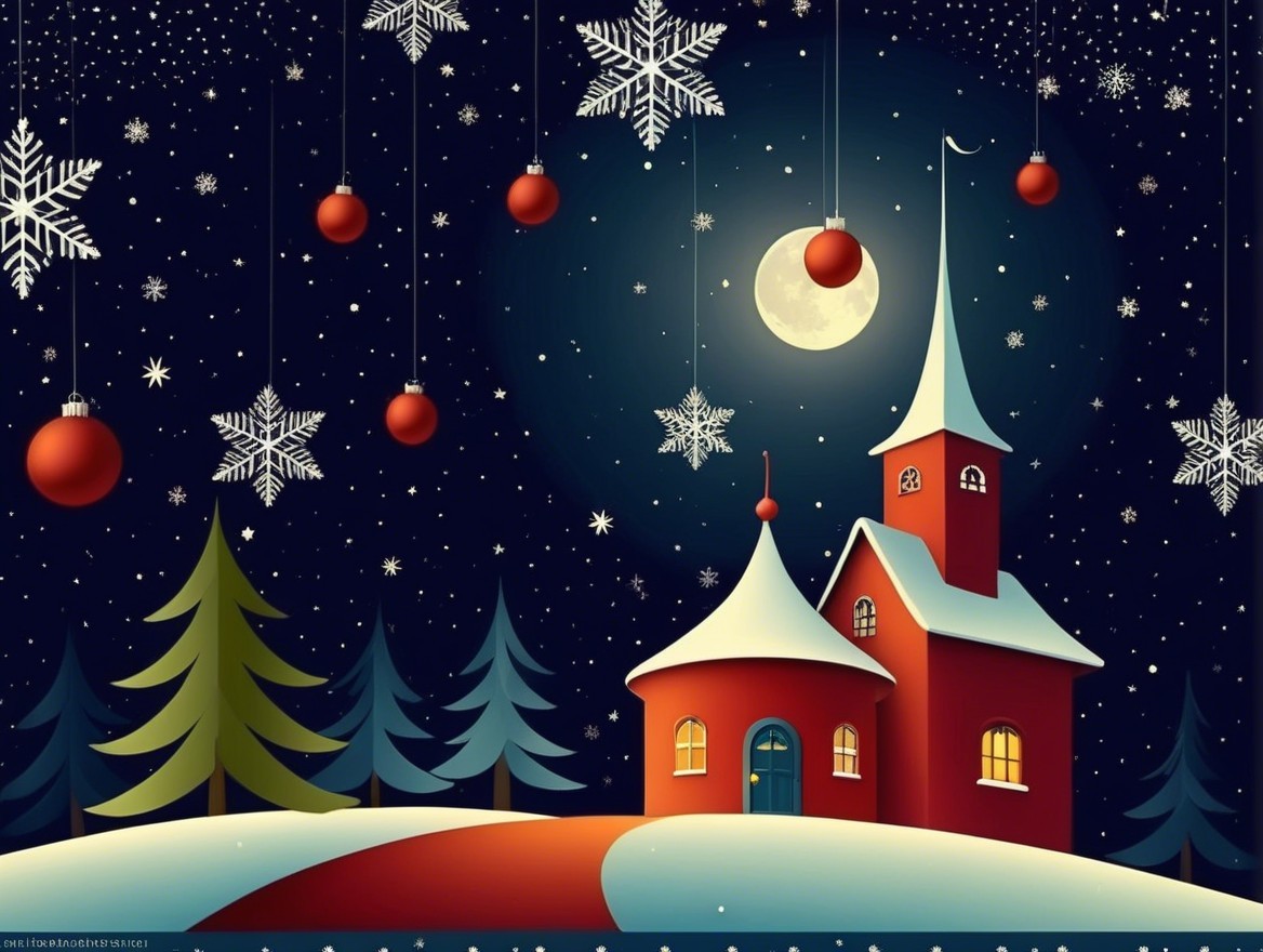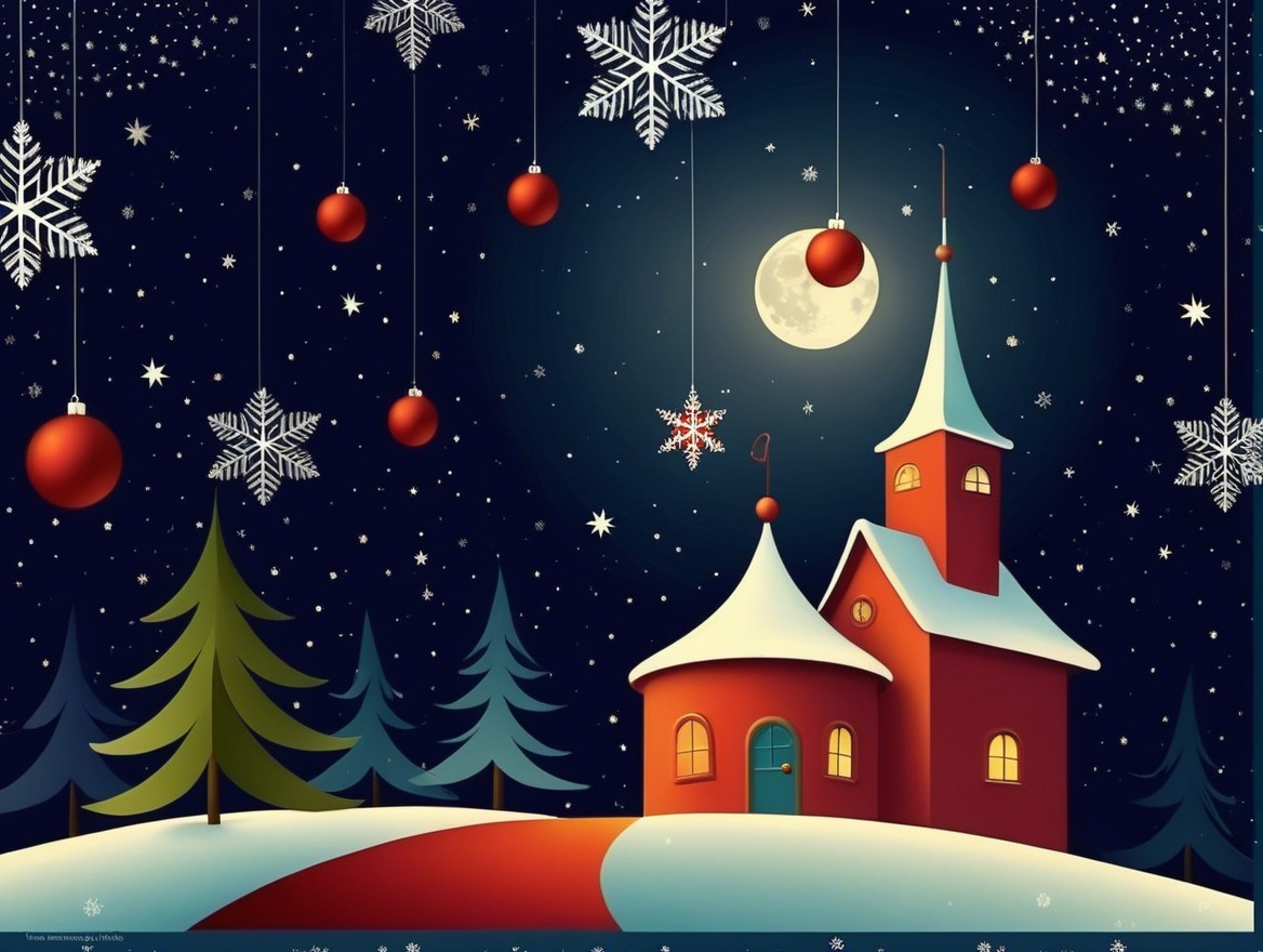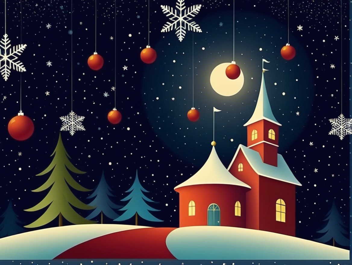 A charming winter scene features a red church with a pointed steeple, surrounded by snow-covered trees, hanging ornaments, snowflakes, and a glowing moon against a starry night sky.