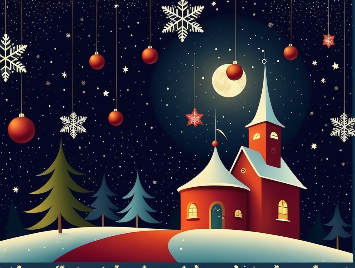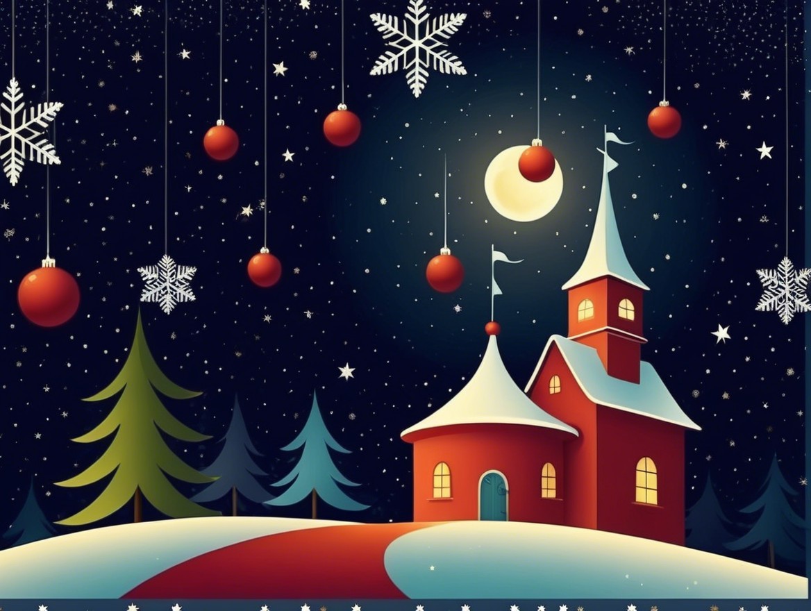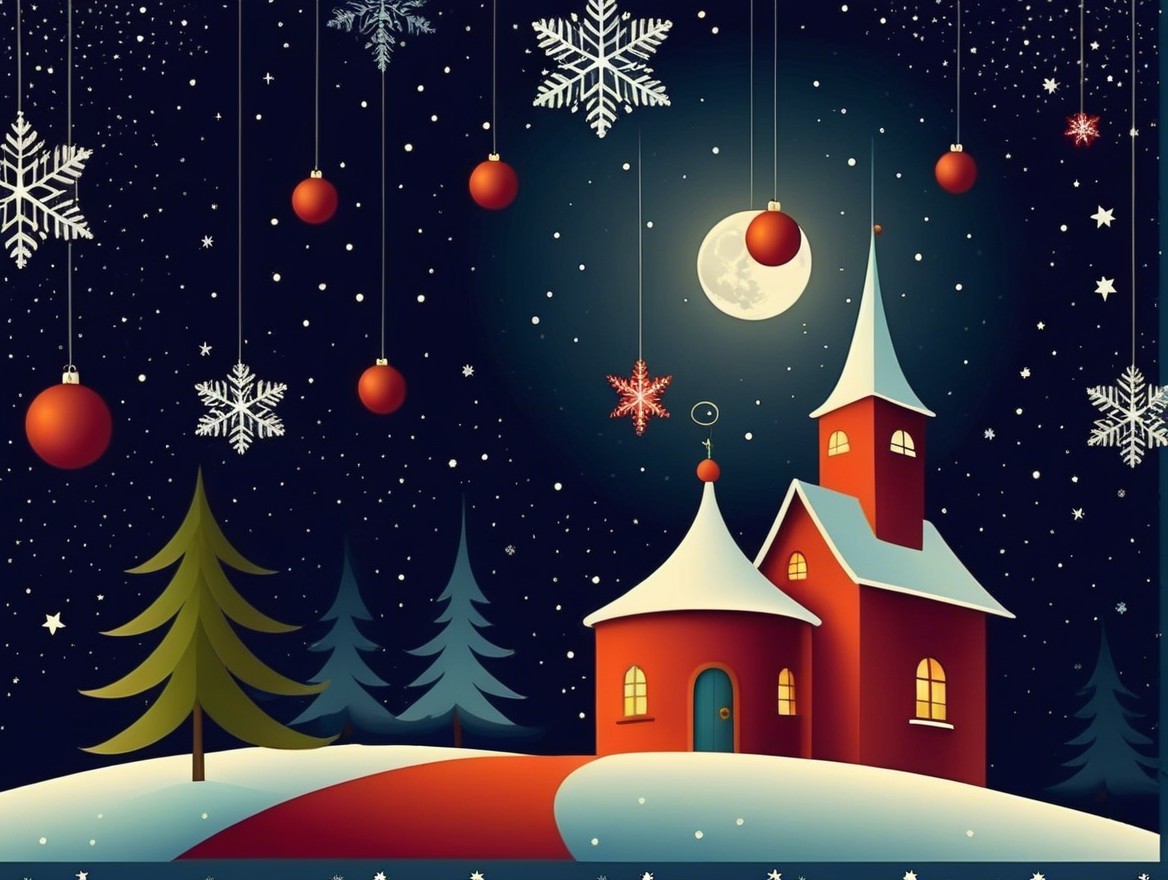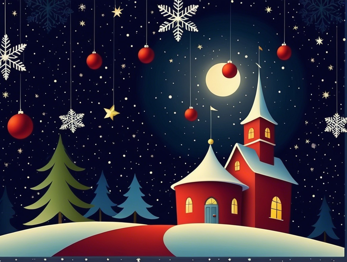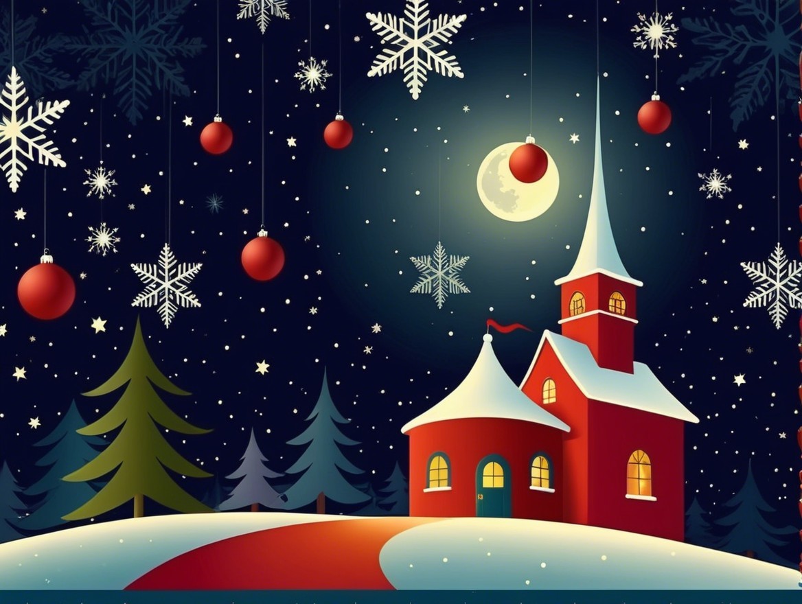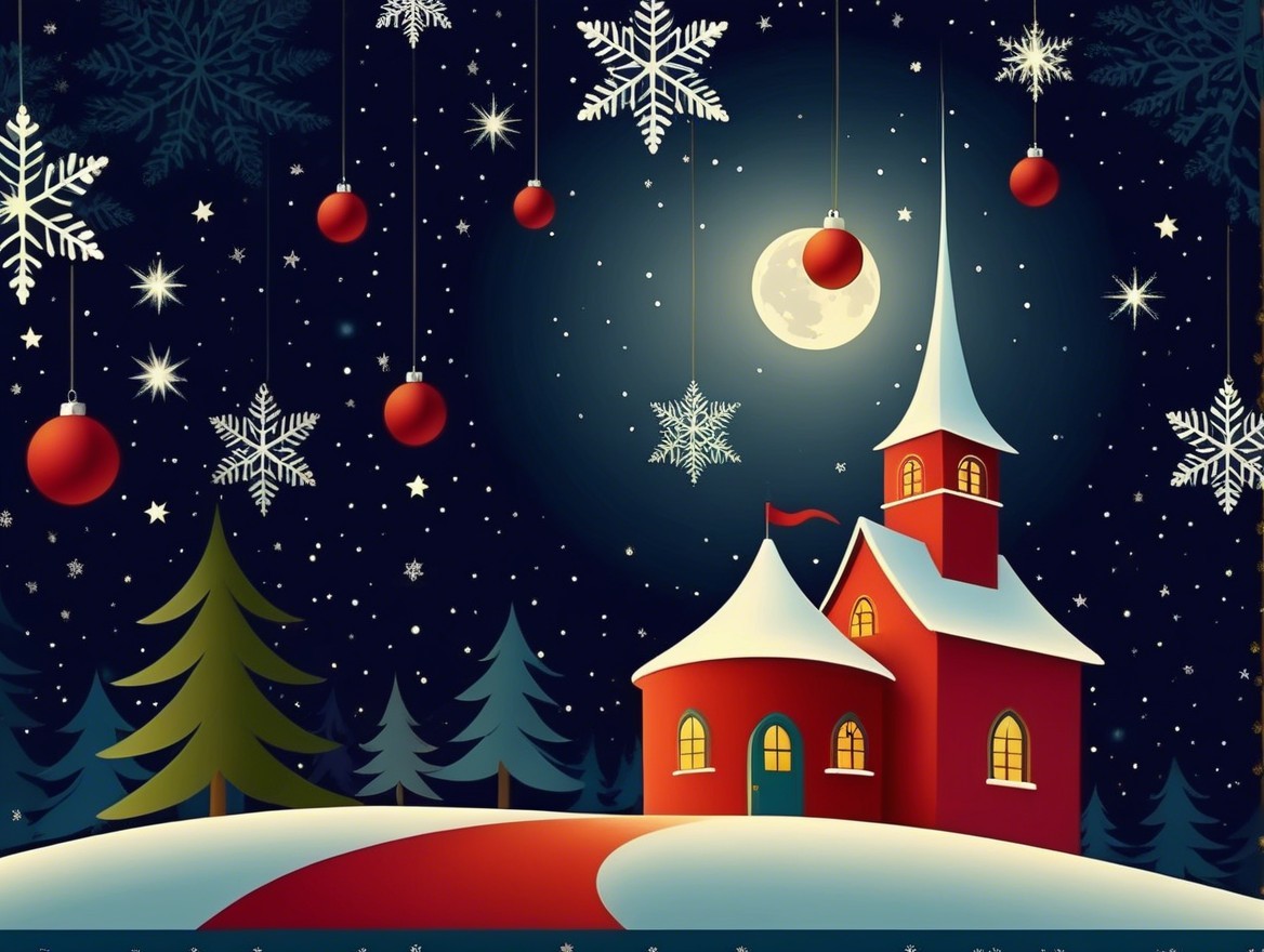 A charming winter scene features a red church with a pointed steeple, surrounded by snow-covered trees, hanging ornaments, snowflakes, and a glowing moon against a starry night sky.