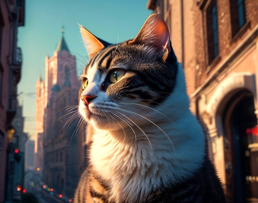 A close-up of a tabby cat with striking green eyes gazes thoughtfully into the distance, framed against a beautifully lit city street at sunset. The scene combines urban charm with feline elegance.