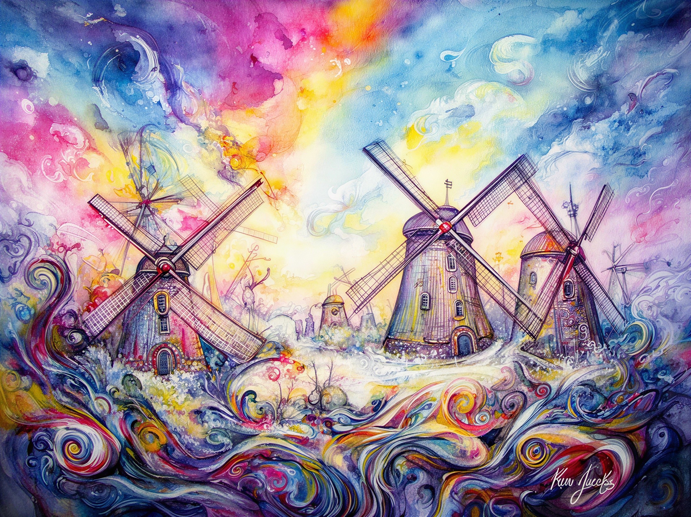A vibrant oil drawing on textured paper captures the charm of whimsical windmills. This high-detail artwork blends abstract expressionism and surrealism, showcasing a picturesque and colorful fantasy world.