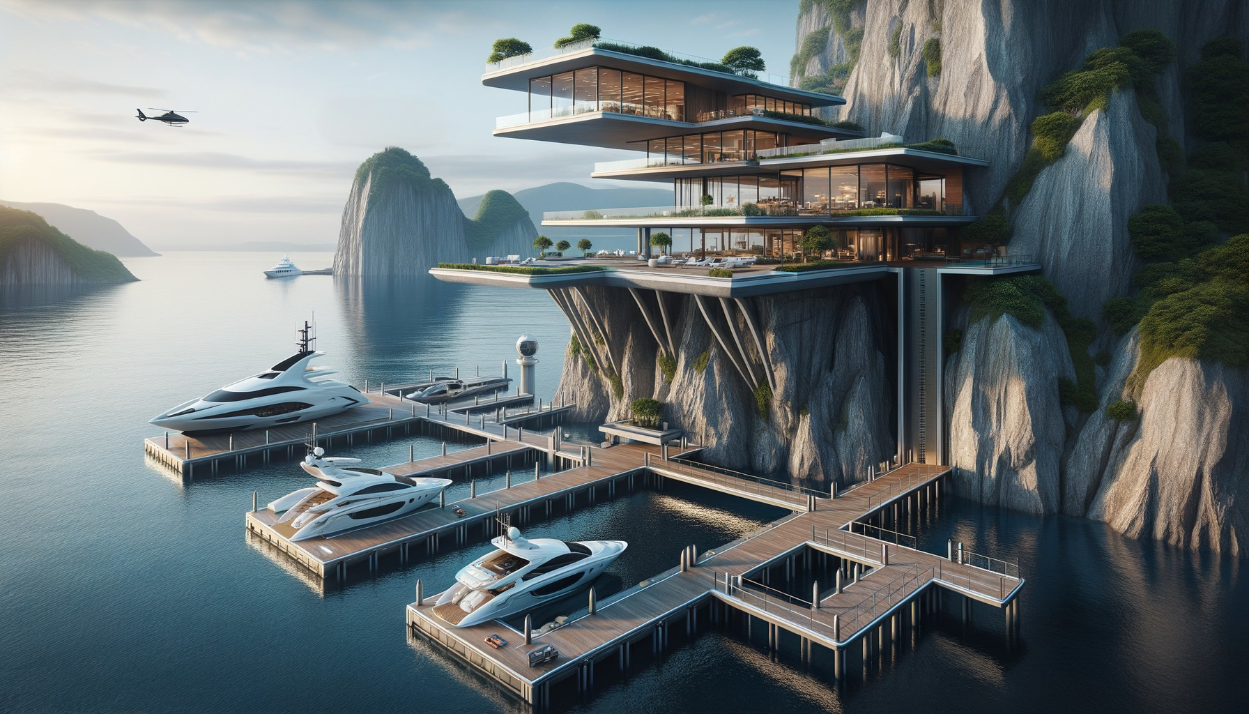 Futuristic cliffside villa with terraces, surrounded by yachts, a helipad, and lush scenery, under a serene sky.