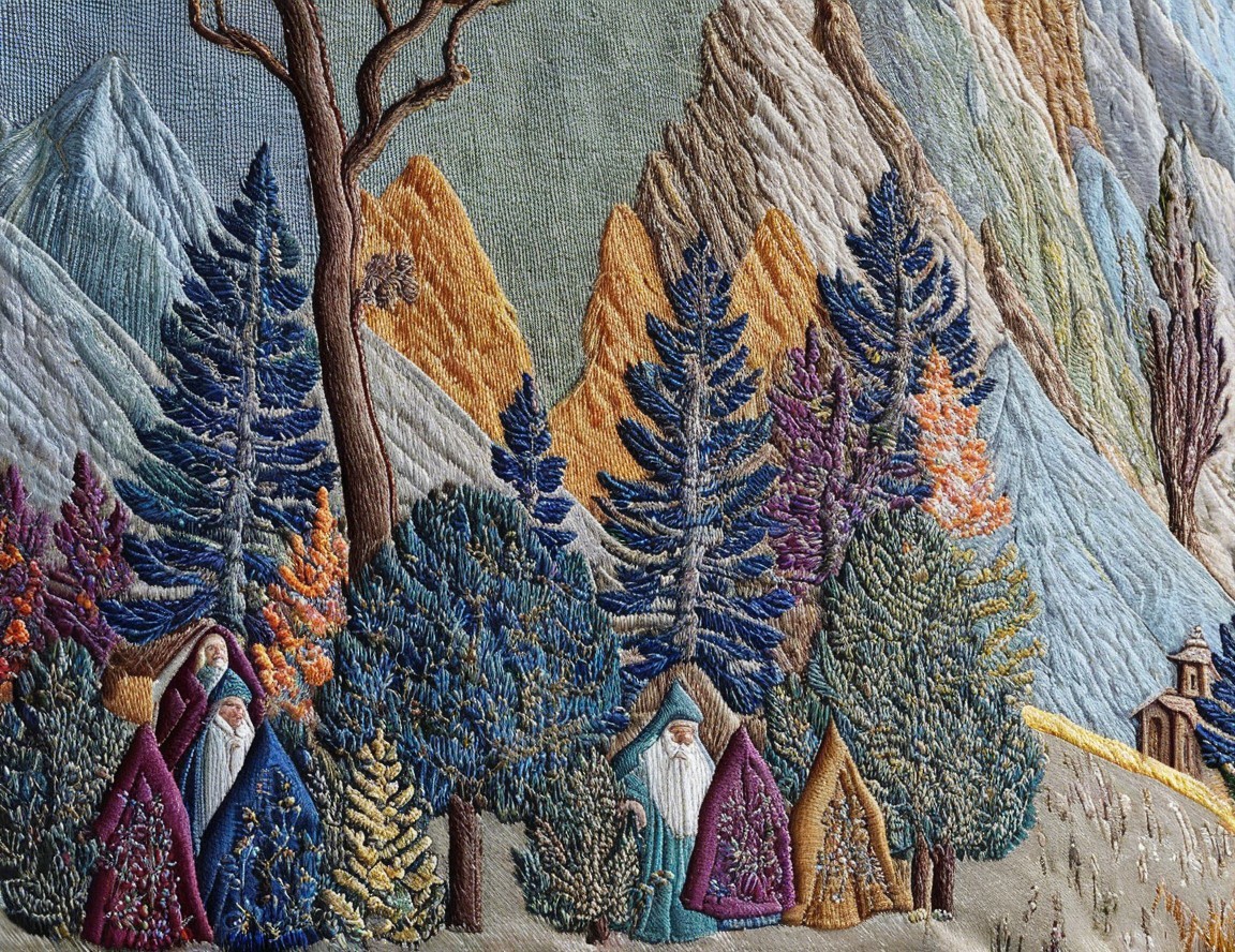 + Prompt:Embroidered on coarse linen fabric, colorful, old pilgrims in brocade cloaks wandering through a mountainous landscape, emeritus hermitage, small chapel, mountain pines,rough structure, intricate, highly detailed, high contrast, inspired by Benozzo Gozzoli and Mikalojus Konstantinas Čiurlionis