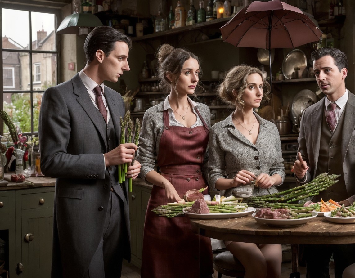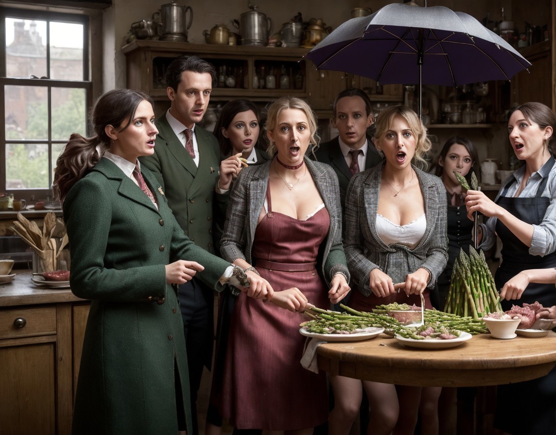 Prompt: Chaos. Shouting. 4 friends in a chaotic scene fighting. Modern clothes. Bouquet of broken asparagus. Vintage umbrella. Dobby sculpture. Steak tartare. Chaotic scene. Four adults in an English country kitchen. A woman holding 10 broken asparagus spears in her hand. Next to her a woman eating raw meat. A man without trousers holding a vintage umbrella. And a third woman holding a Dobby sculpture. Dobby. Dobby. Strak tartare. Meat.
