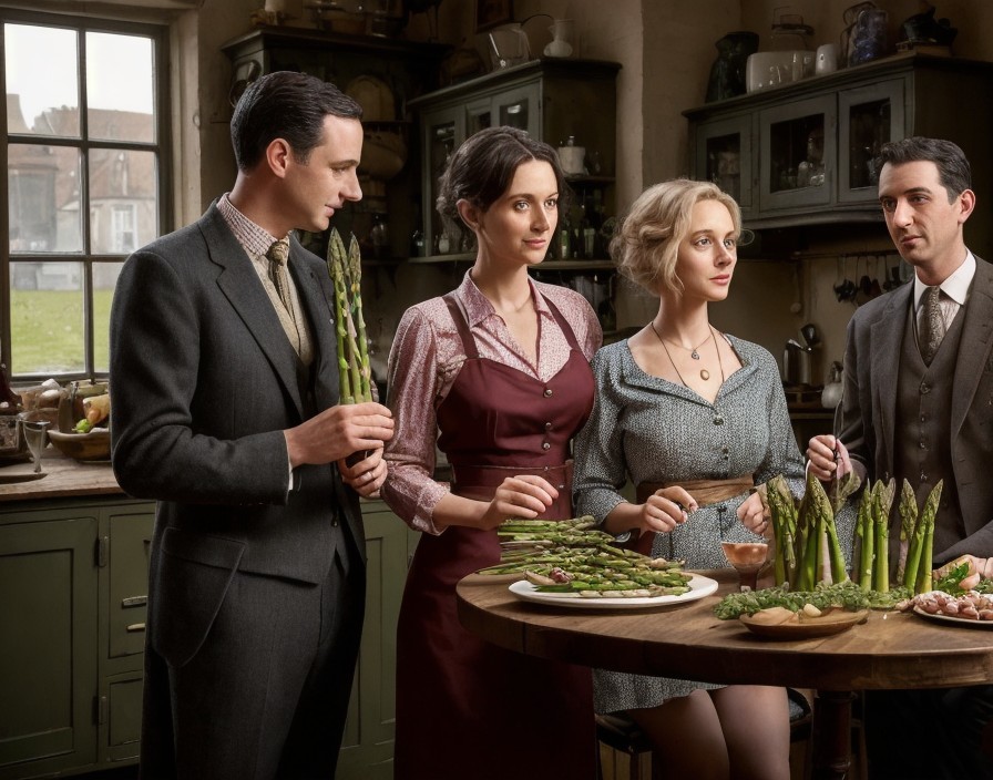 Prompt: "4 friends. Bouquet of asparagus. Vintage umbrella. Dobby sculpture. Steak tartare. Chaotic scene. Four adults in an English country kitchen. A woman holding 10 broken asparagus spears in her hand. Next to her a woman eating raw meat. A man without trousers holding a vintage umbrella. And a third woman holding a Dobby sculpture."