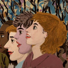 Prompt: "Oil painting on rough fibrous paper, three faces of teenagers in profile, thoughtful with a little smile, one cheerful, one serious, one proud, different hair colors, different skin colors, background patterned with faces and owls, half relief, inspired by Ernst Ludwig Kirchner and Bernard Buffet"