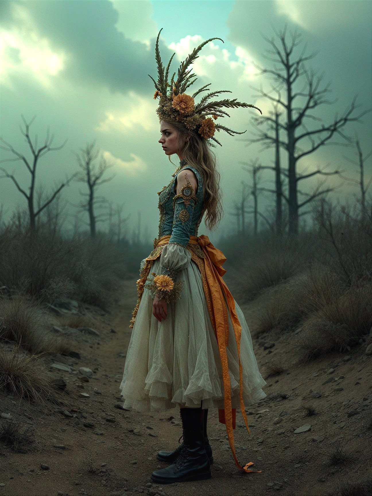 A woman in a whimsical gown adorned with flowers and golden accents stands in a desolate landscape, with barren trees and a cloudy sky, embodying a blend of elegance and decay.