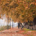 A serene autumn landscape features a quaint wooden house nestled among vibrant, colorful trees. A winding path leads to tranquil waters and distant mountains, evoking a peaceful, cozy atmosphere.