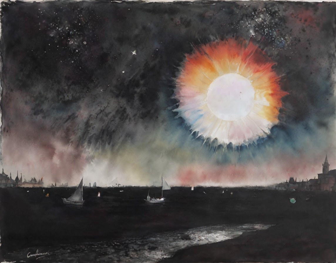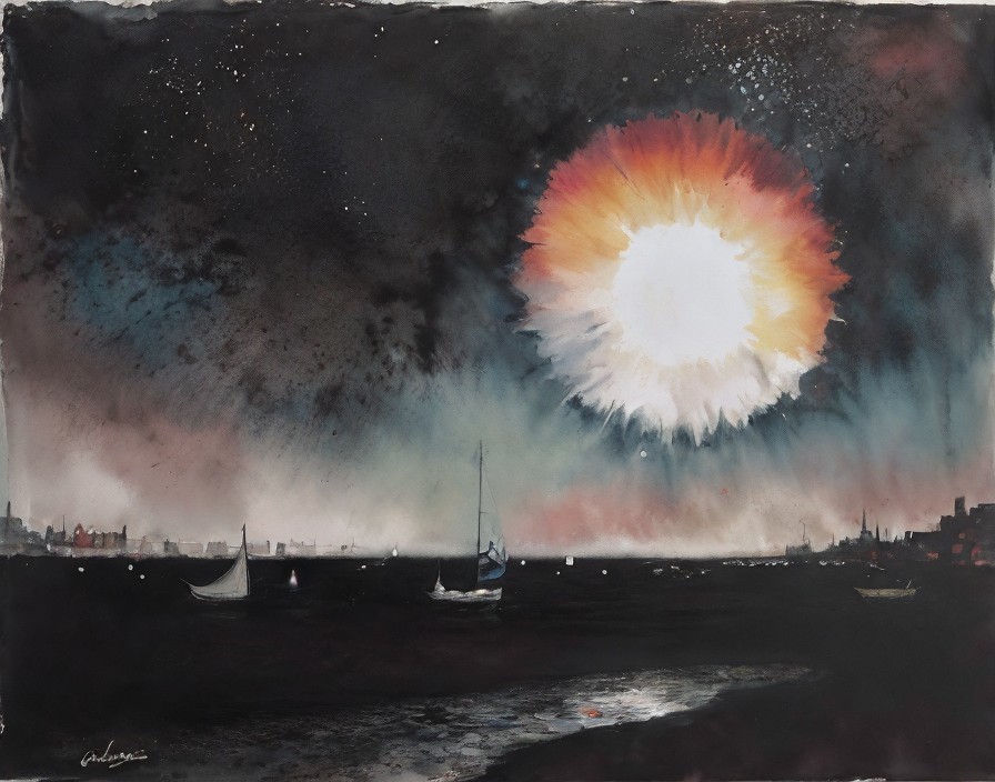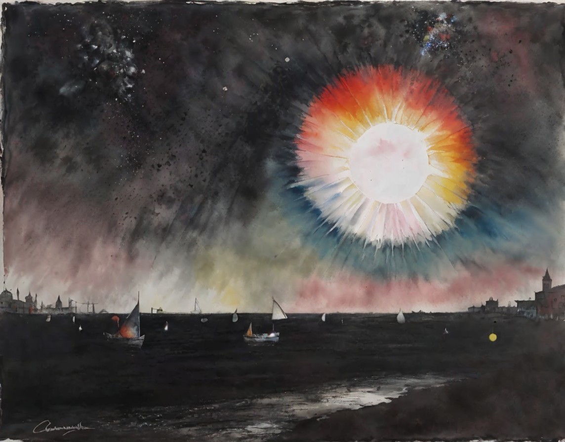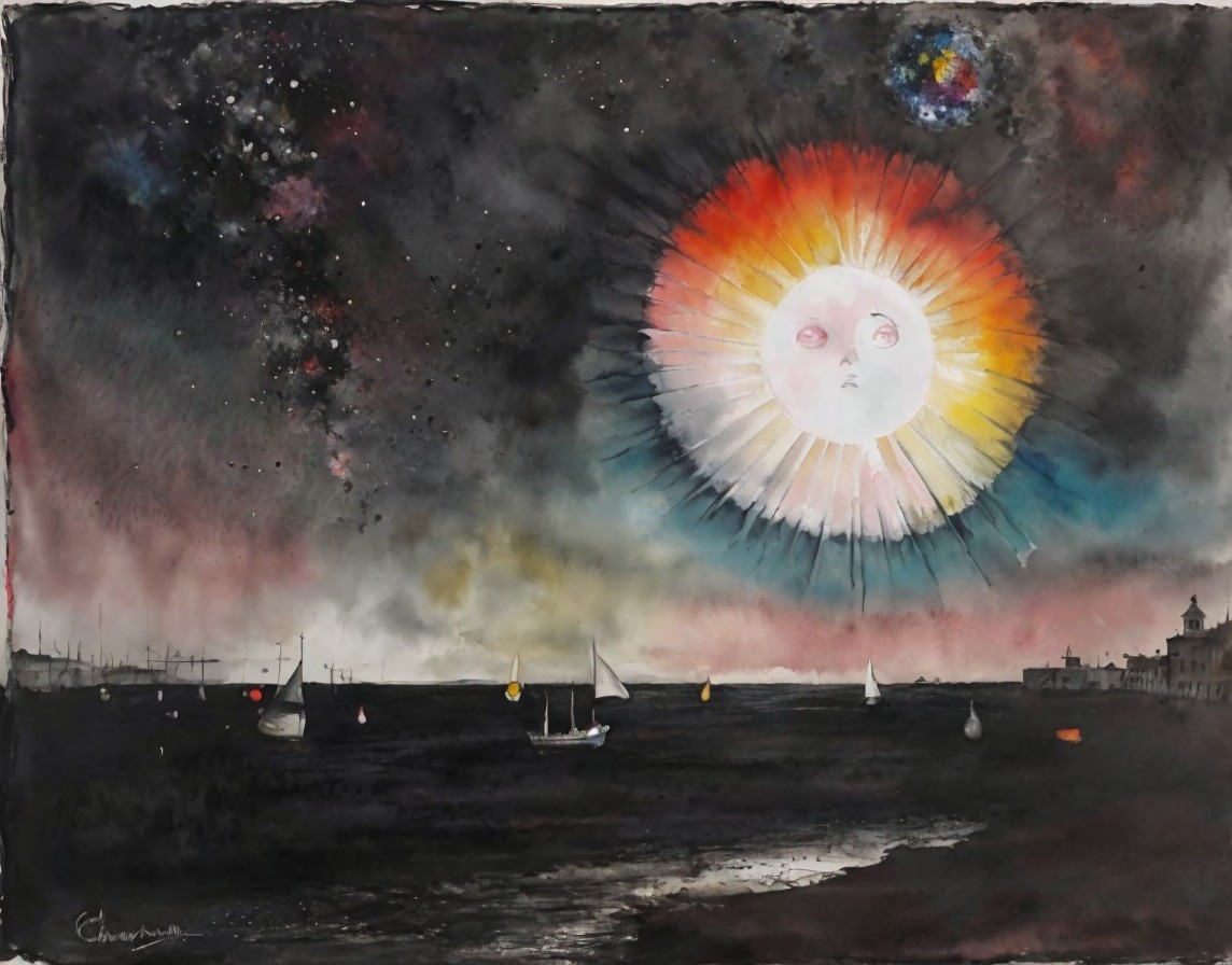 Stylized sun with human face over dark seascape and fireworks.