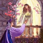 A serene scene features a young man reaching out to a young woman amidst blooming pink flowers. The soft light and ethereal ambiance create a magical and romantic atmosphere.