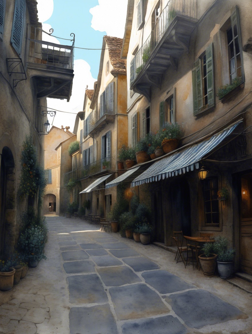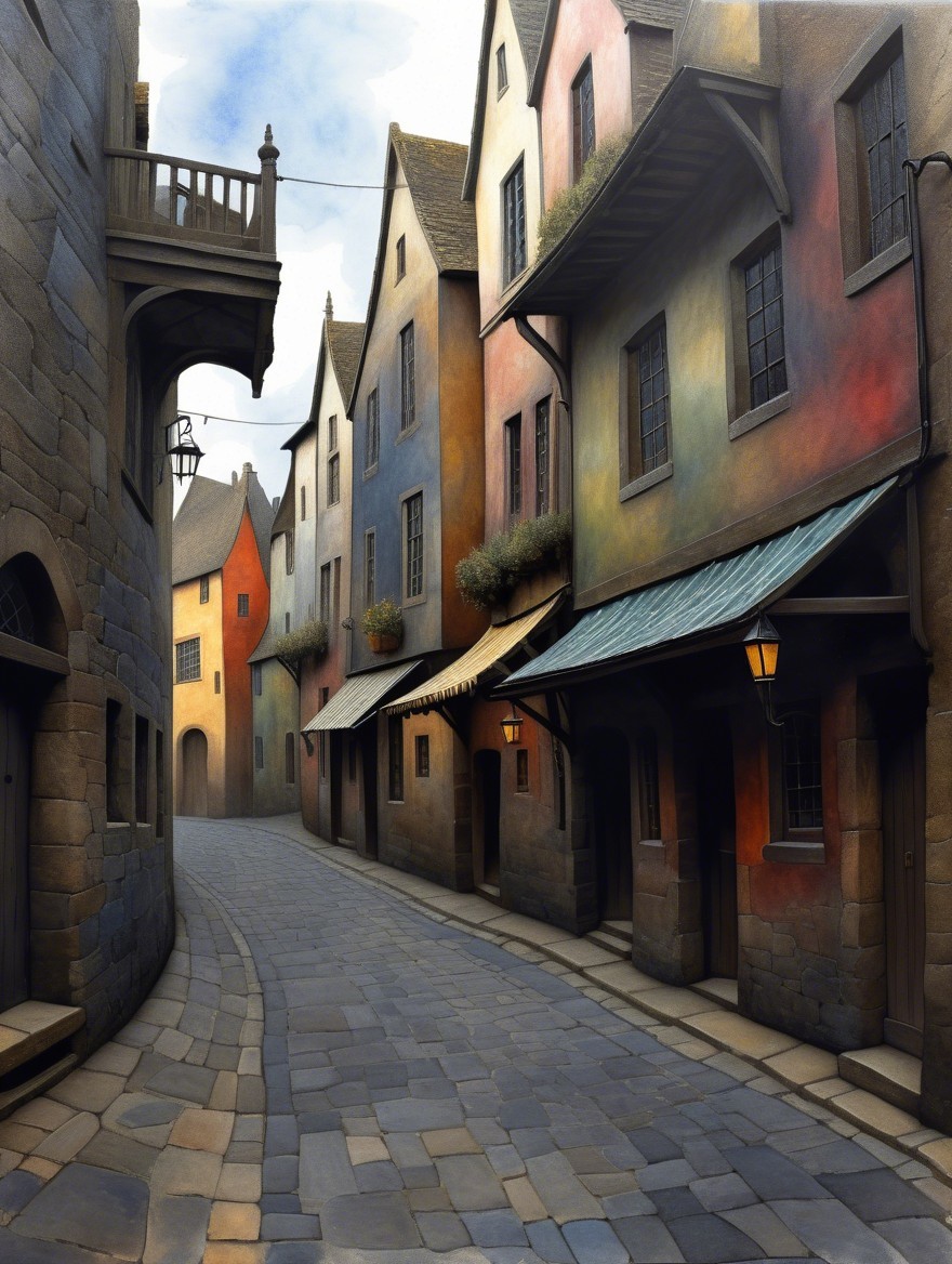 A charming, cobblestone street features pastel-colored houses with flower boxes. Dim lampposts illuminate the scene as figures stroll, framed by misty hills and a distant castle.