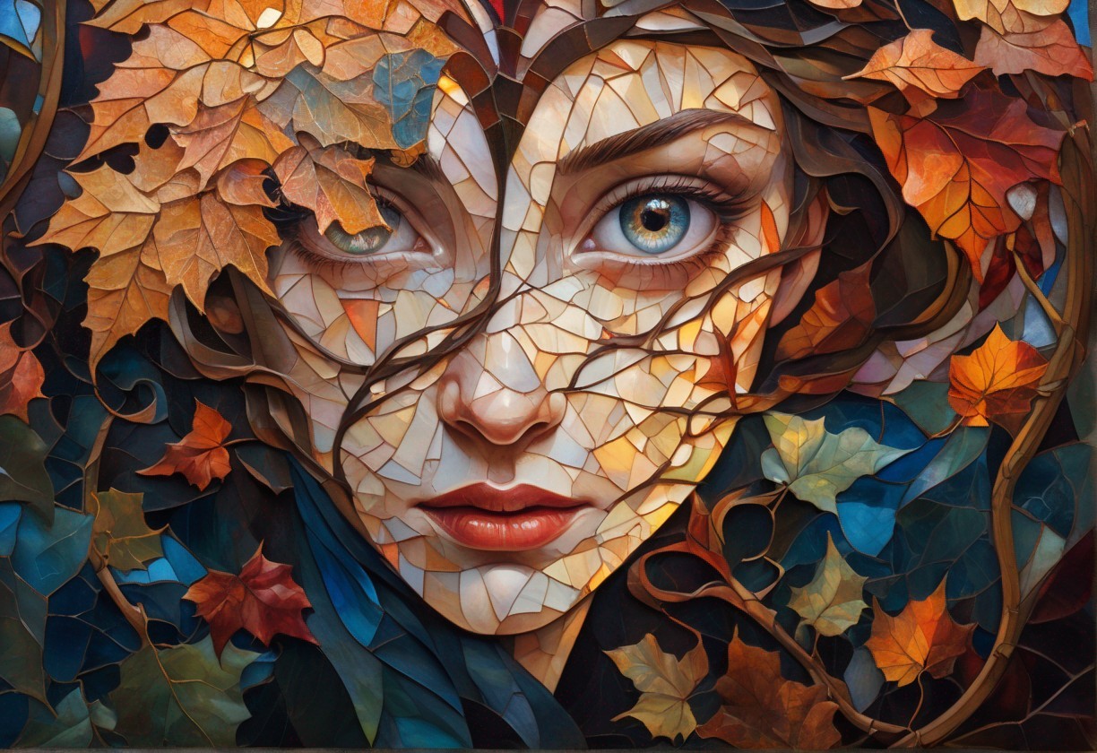 mail art, medieval, oil on canvas, fairytale art on cracked paper, epic, dynamic poster, portrait, dynamic pose, light and shadow, sharp glowing eyes, vines, by Michelangelo, James Jean, Andy Kehoe, patchwork mosaic stained glass background, highly detailed intricate, high quality, luminism