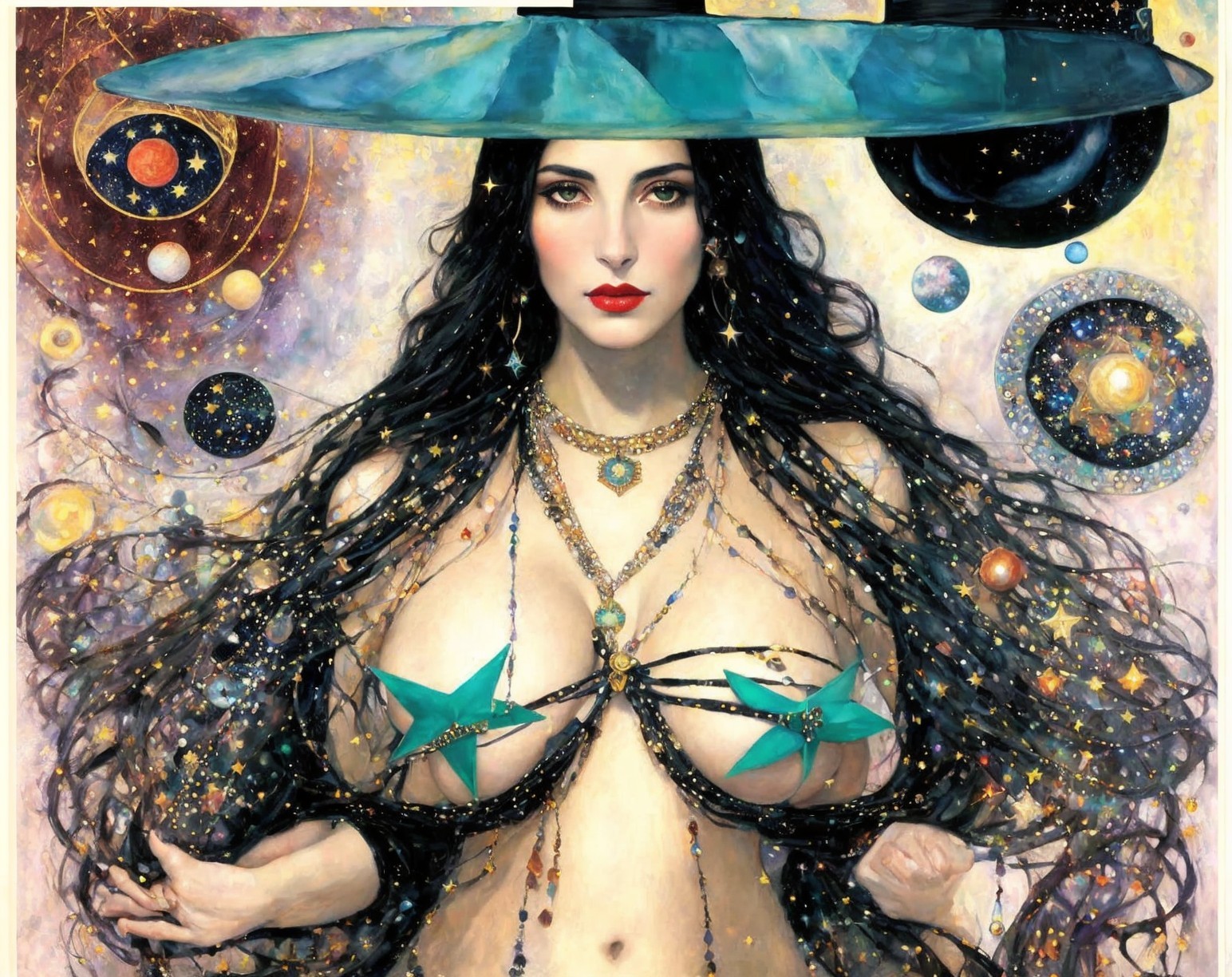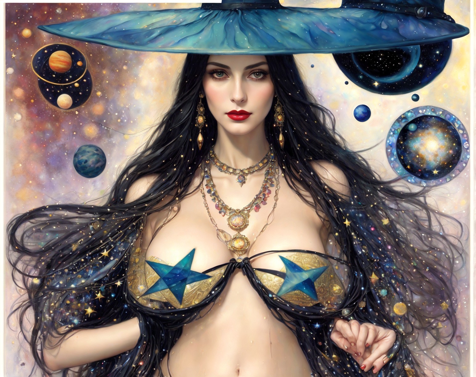 A fantasy artwork of a woman with a galaxy-themed hat, starry attire, and holding a mystical orb, with planets and stars in the background.