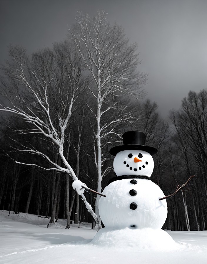 Prompt: "A chillingly haunting snowman, its icy form conveys a sense of terror. This visual masterpiece, portrayed as an eerie black and white photograph, captures the snowman's menacing attributes: a twisted, gnarled grin filled with sharp, jagged teeth, eyes that gleam with malevolence beneath a frosty brow, and skeletal twig arms reaching out in a menacing gesture. The image exudes an air of icy dread, leaving viewers captivated by its alarming depiction of a fearsome snowman."