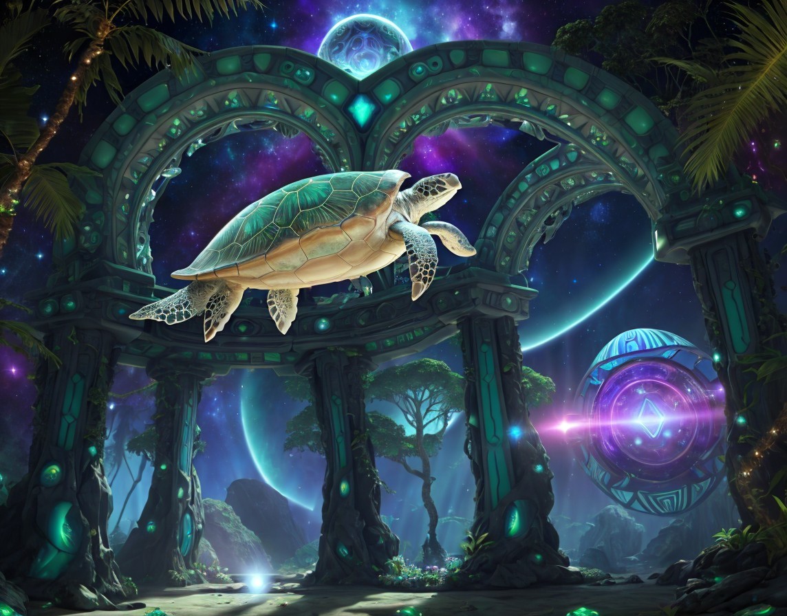 Prompt: sea turtle shaped spaceship entering a portal in a jungle. Ornate extraterrestrial gateway/portal made of stone and brilliant crystals on a glowing cosmic platform covered in intricate alien glyphs and sacred geometric patterns. The gateway is on an alien jungle planet. Ultra-realistic landscape. Astral projection, alien contact, and surreal psychedelic vibes inspired by the sci-fi LSD art aesthetic. In the style of Cameron Gray