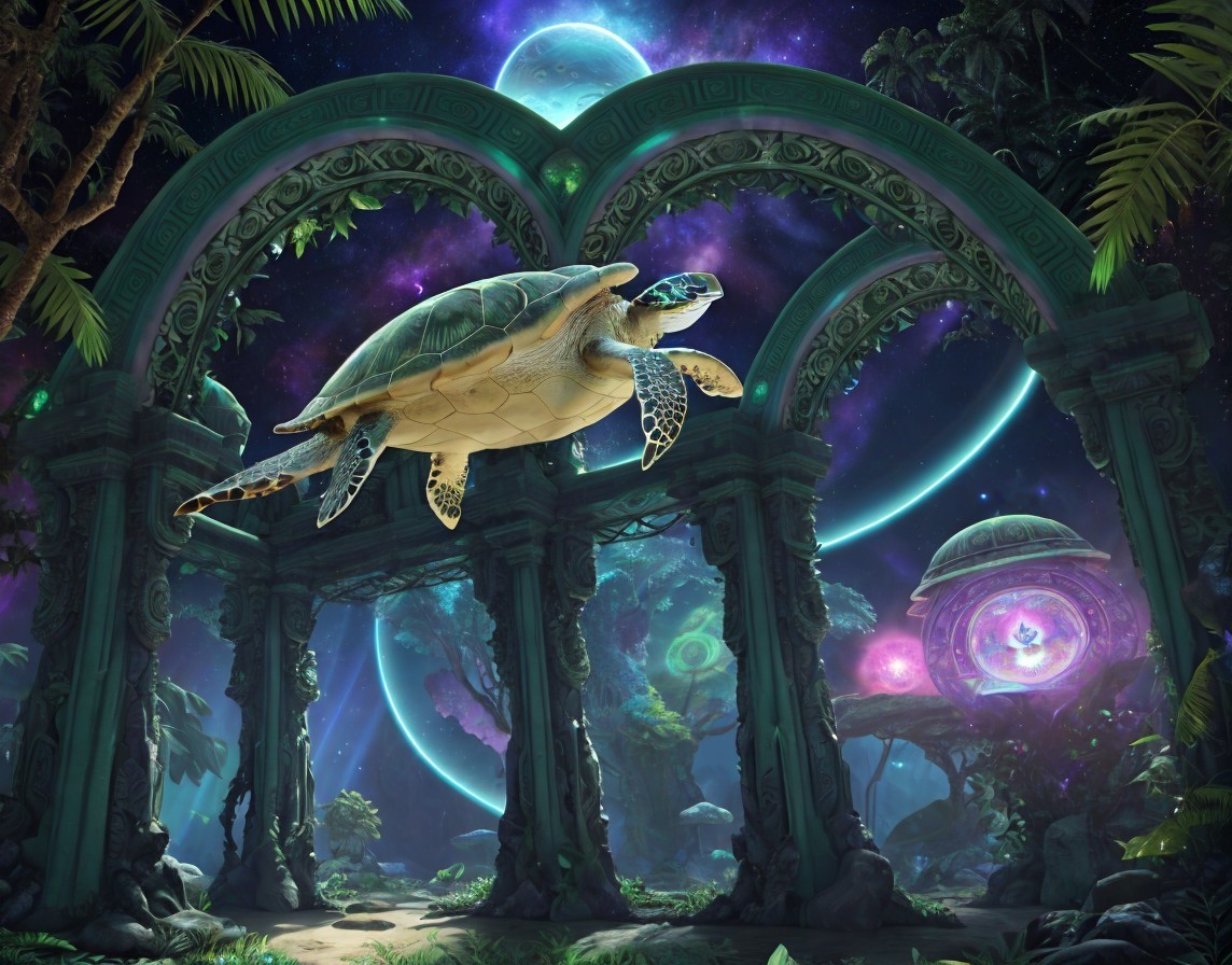 sea turtle shaped spaceship entering a portal in a jungle. Ornate extraterrestrial gateway/portal made of stone and brilliant crystals on a glowing cosmic platform covered in intricate alien glyphs and sacred geometric patterns. The gateway is on an alien jungle planet. Ultra-realistic landscape. Astral projection, alien contact, and surreal psychedelic vibes inspired by the sci-fi LSD art aesthetic. In the style of Cameron Gray