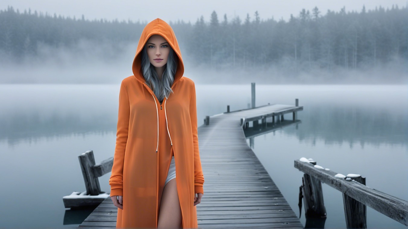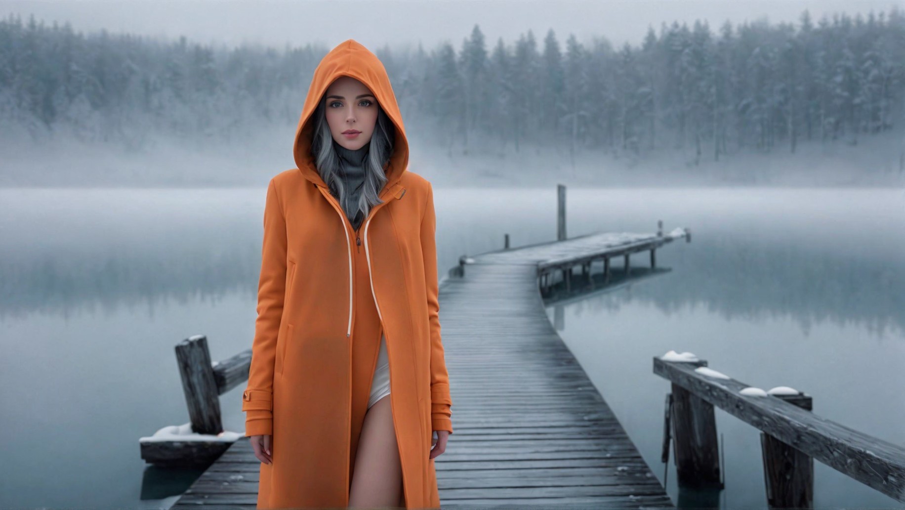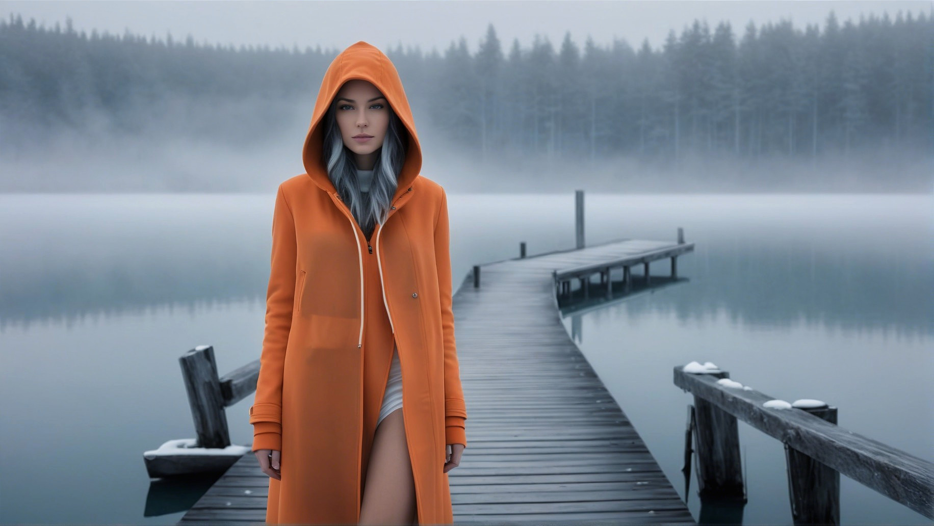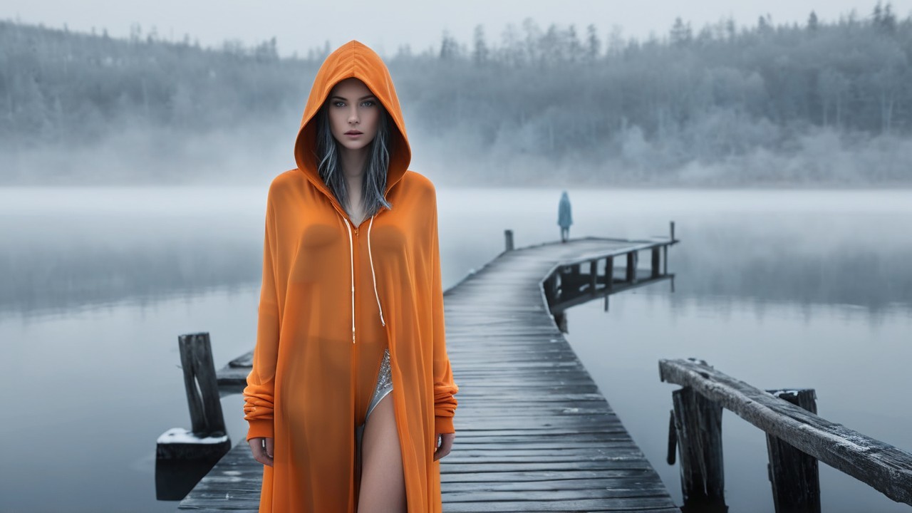 A young woman in a striking orange hooded coat stands on a misty wooden pier, surrounded by a serene lake and dense fog, evoking a sense of solitude and mystery.