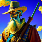 A wise man with a long white beard and a straw hat reads a book outside, surrounded by vibrant flowers and a bright sky filled with fluffy clouds, exuding a sense of calm and curiosity.
