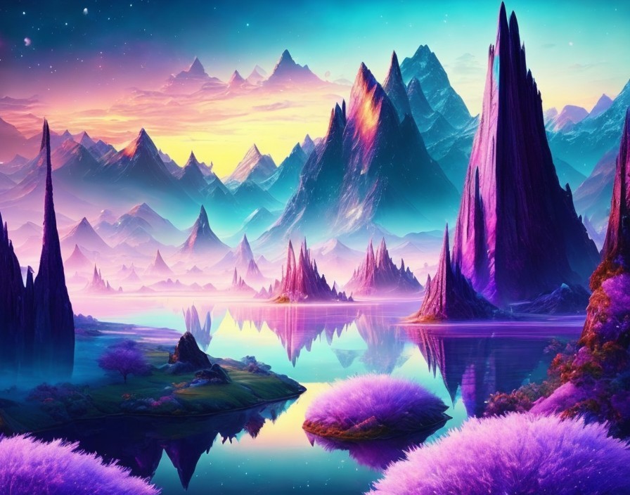 Prompt: "Create an enchanting fantasy landscape where a magical river winds its way through a breathtaking scene. Imagine majestic mountains, their peaks cloaked in sparkling snow, standing sentinel on either side. The sky is a canvas of otherworldly colors, with hues of iridescent purples, blues, and pinks as the sun sets in a fantastical display. Illuminate the magical river with a gentle, ethereal glow, emphasizing the mystical nature of the surroundings. Craft a fantastical and visually captivating setting that transports the viewer to a realm of wonder and magic."