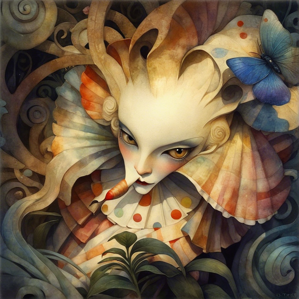 A surreal portrait of a pale clown-like figure with oversized ruffled collar and orange dots, surrounded by lush green foliage and butterflies, evoking a whimsical and mysterious atmosphere.