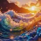 A vibrant sunset casts golden hues over dynamic ocean waves, shimmering with colorful highlights and splashes. The scene radiates tranquility and beauty, merging nature's power with serenity.
