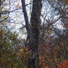 A tall, gnarled tree stands amidst a tapestry of autumn foliage. Its textured bark contrasts with the surrounding colorful leaves, creating a tranquil, inviting woodland scene.