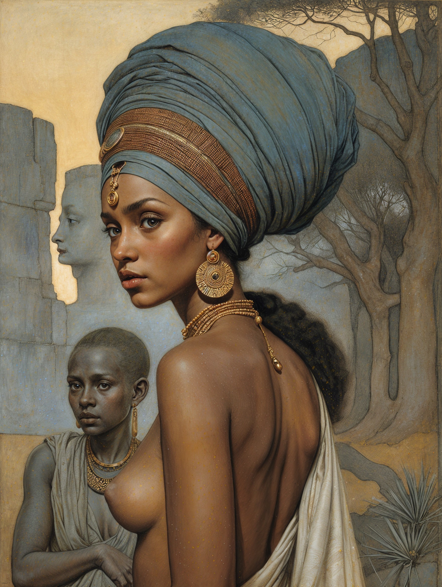 A beautifully styled woman with a rich, textured hairstyle wears a striking headwrap and elegant jewelry. She stands against a serene backdrop, exuding grace and mystique.