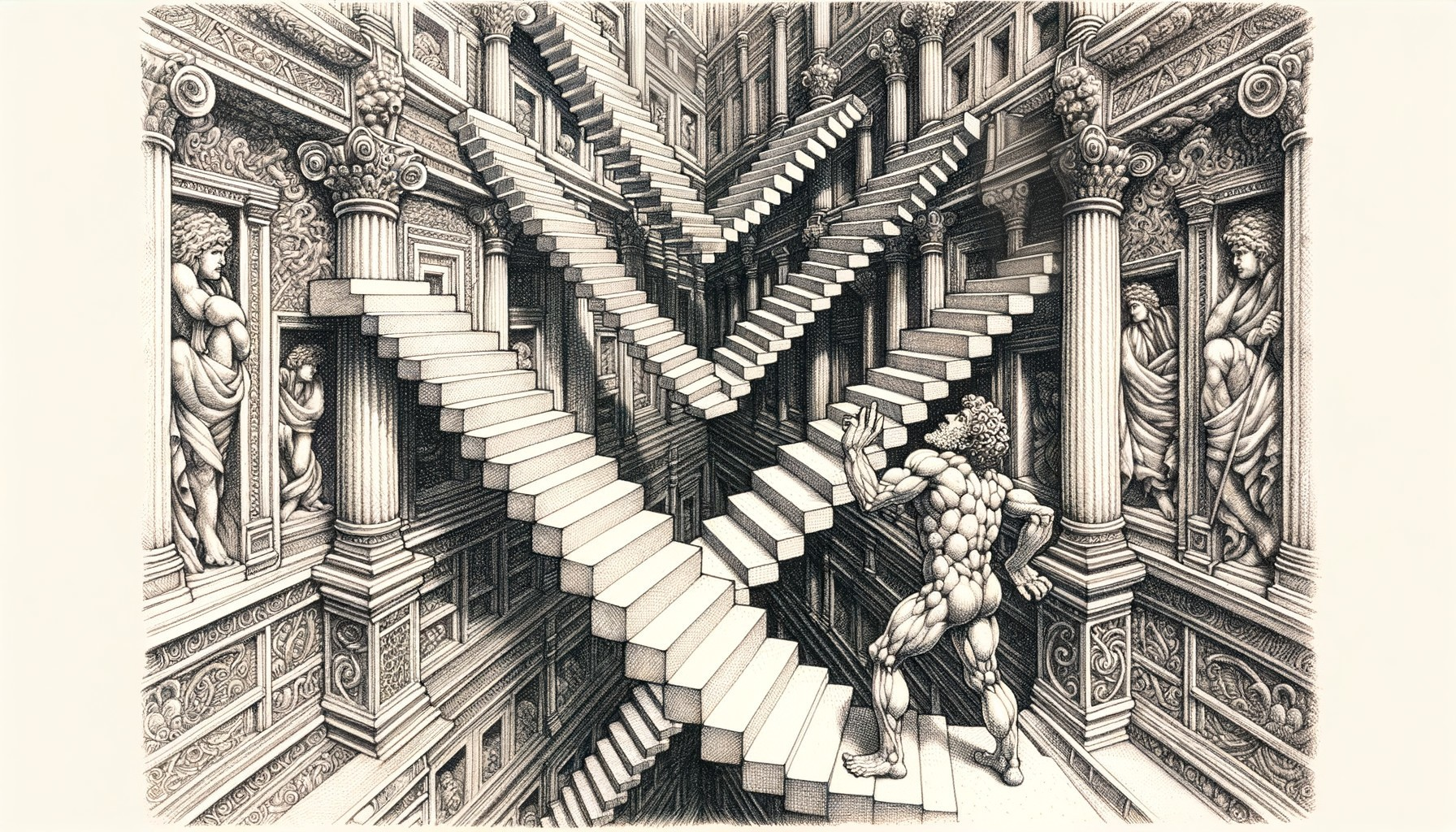 An intricate drawing of an impossible staircase with figures ascending and descending within a classically detailed architectural setting.