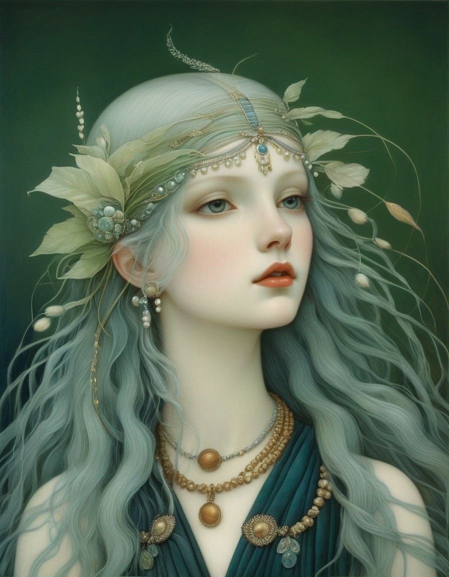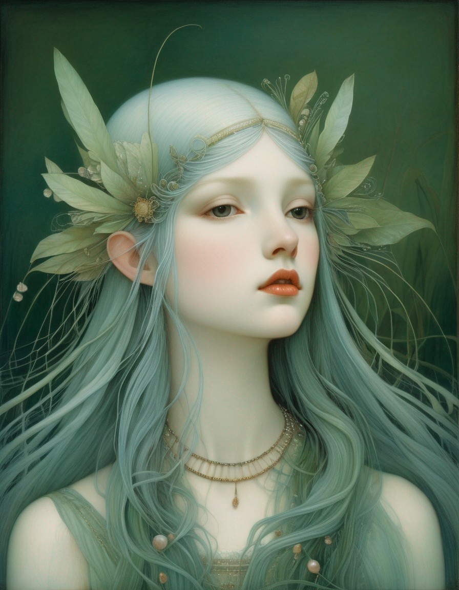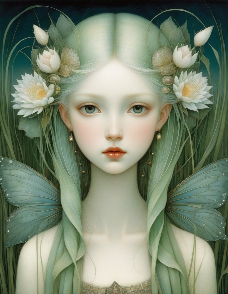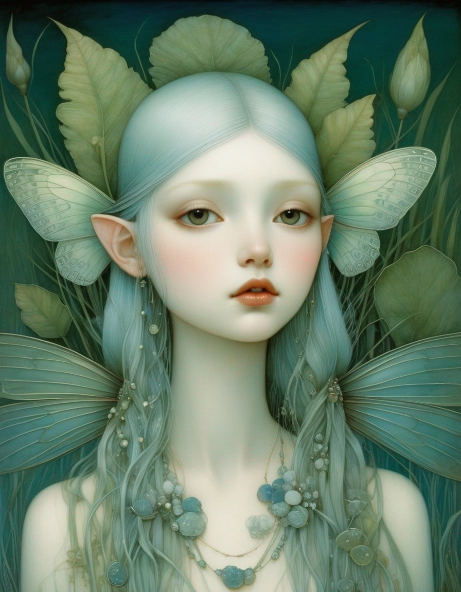 Surreal portrait of female figure with elfin ears and butterfly wing hair adornments
