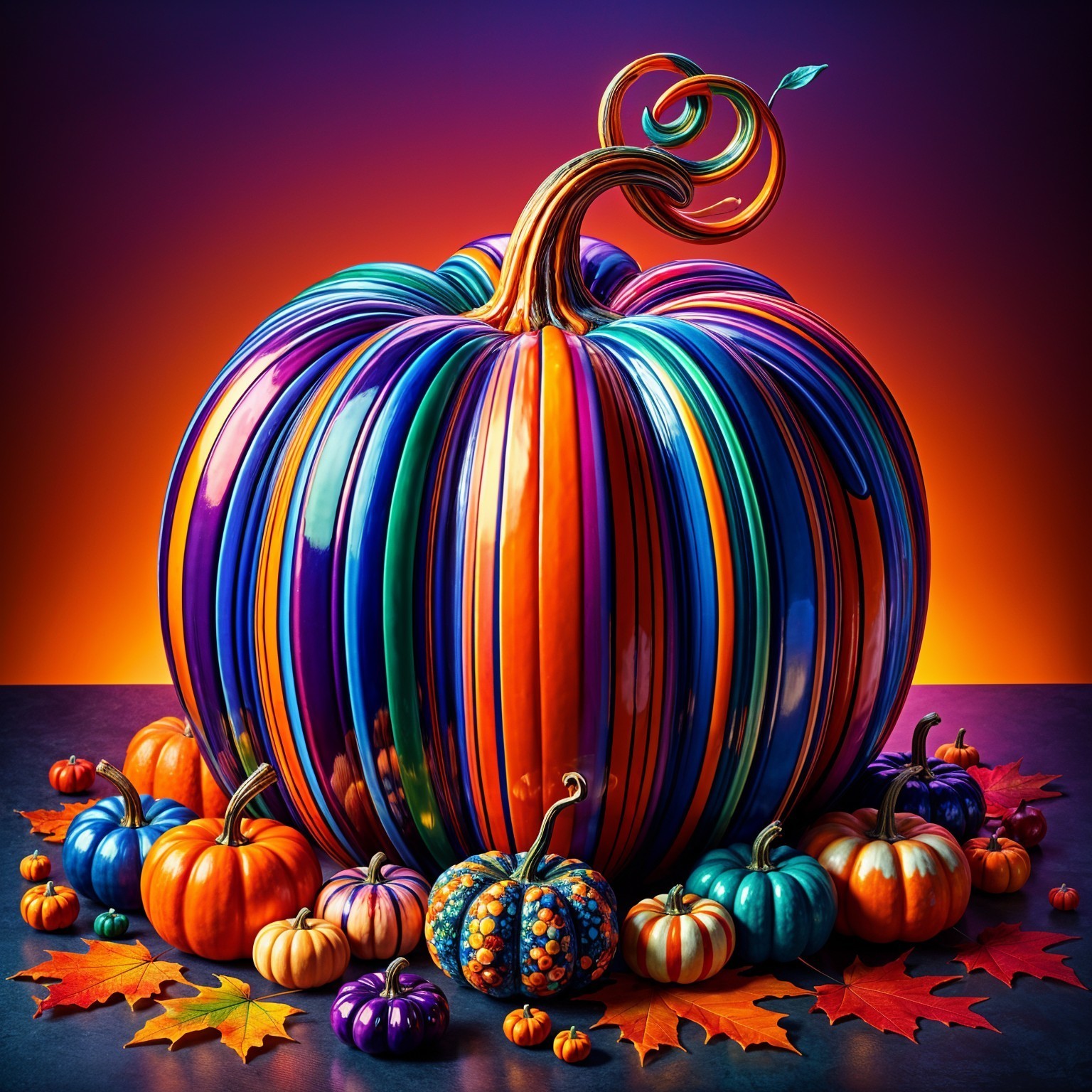 A vibrant, intricately designed pumpkin in shades of teal and purple sits at the forefront, surrounded by smaller pumpkins and colorful leaves, all under a glowing, magical backdrop.