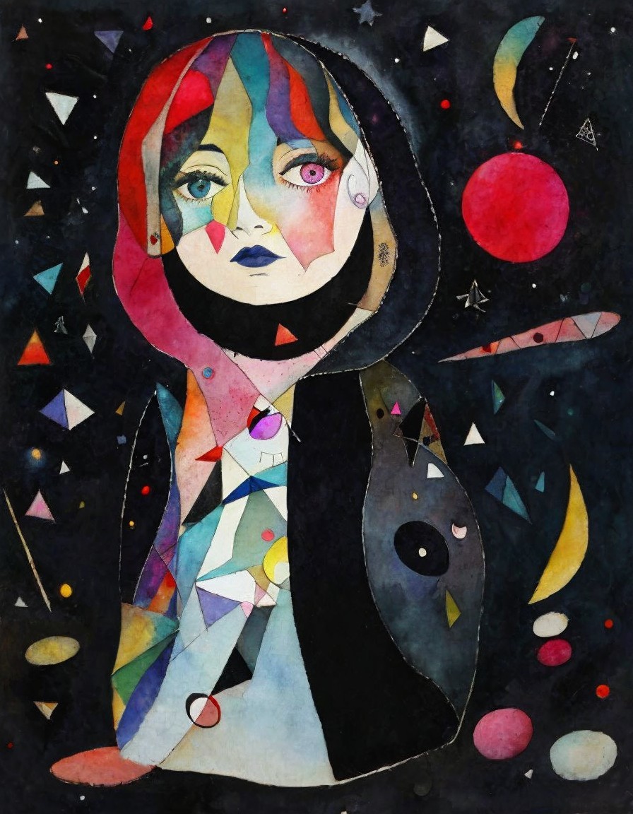 Prompt: "Enfant perdu au centre de la terre, au milieu de la nuit cosmique noire, mix of destroyed collage with watercolors Meghan Duncanson and Jennifer Lommers and Didier Lourenço and Joan Miró, effets métalliques"