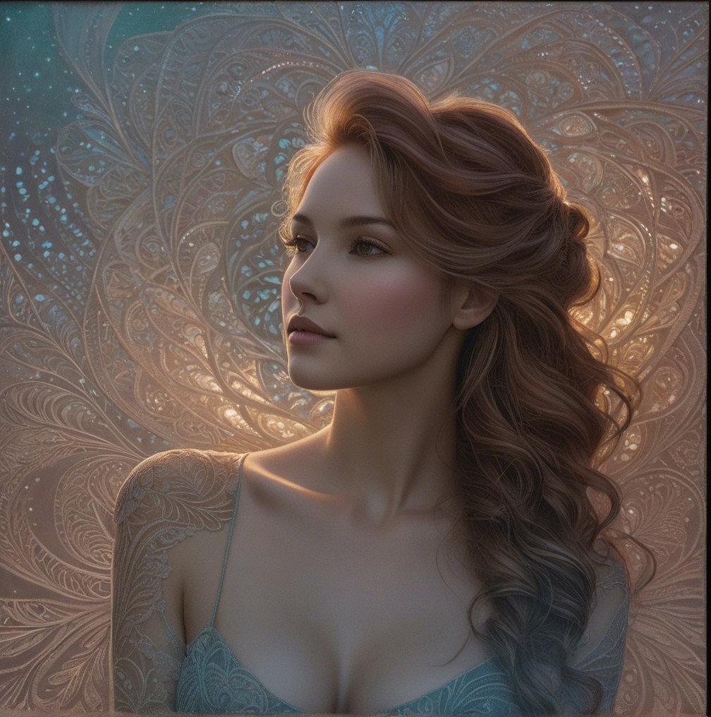 + Prompt:An enchanting portrait featuring deep, muted colors that exude a dreamlike radiance. Embrace plasticity and complexion enhancements with a focus on curves using the zentangle method. Illuminate the scene with dynamic lighting inspired by VFX, creating a softened yet vibrant atmosphere. Enhance the portrait with brightened tones, intricate details, and wavery fluid swirling patterns. Implement subsurface scattering for a lifelike quality and an elegant aesthetic. Utilize a 128k octane render to achieve maximum detail, incorporating volumetric light and colorful ambient occlusion for depth and vibrancy. Integrate colorful ray tracing and parallax occlusion techniques for a visually stunning effect. Ensure raytraced shadows add realism and depth, complemented by dynamic lighting for a captivating look. Let the background fade into a soft, undefined space, highlighting the richness of textures and intense detailing on the subject. Blend matte painting and fantasy concept art elements for a close-up that is both complex and expressive, radiating refinement and energy.