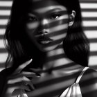 A striking black-and-white portrait of a woman with long hair, illuminated by shadows cast from blinds. Her intense gaze and elegant pose create a captivating and moody atmosphere.
