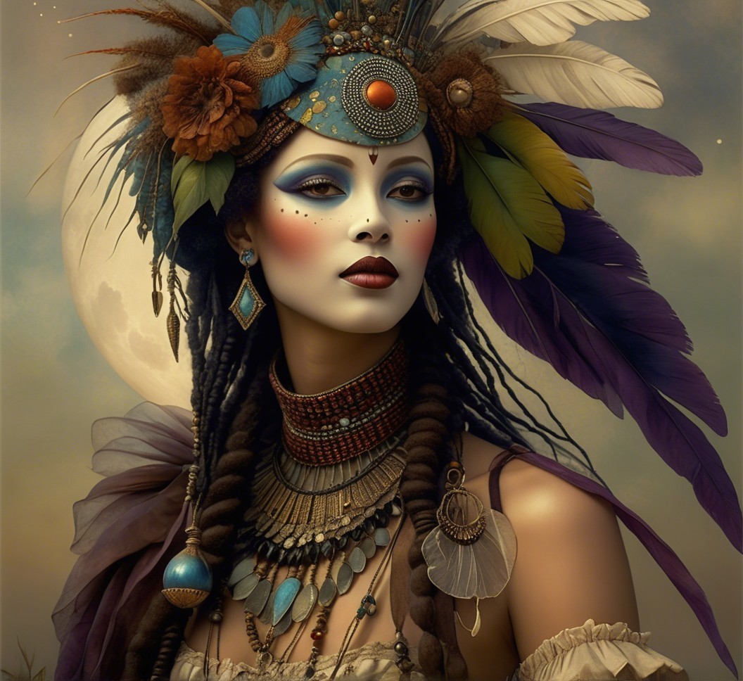 The image features a striking woman adorned with an elaborate headdress, feathers, and jewelry. Her makeup is bold, highlighting her artistic expression against a soft moonlit background.