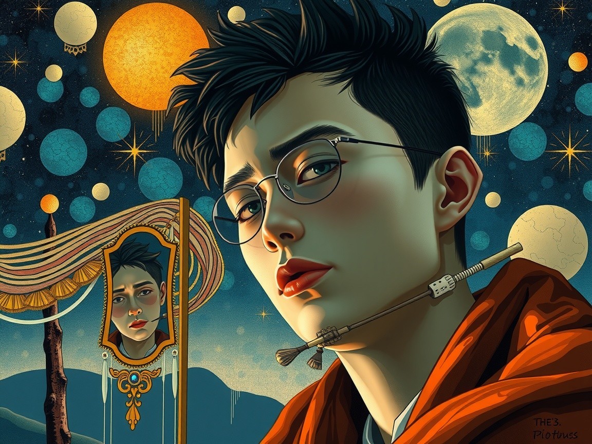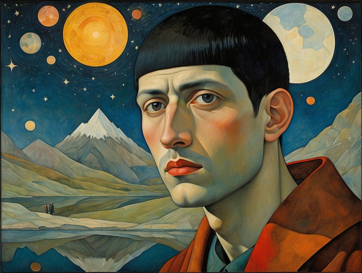 This artwork features a portrait of a man with a striking expression, set against a surreal landscape with mountains, a calm lake, and celestial bodies, blending realism and vibrant colors.