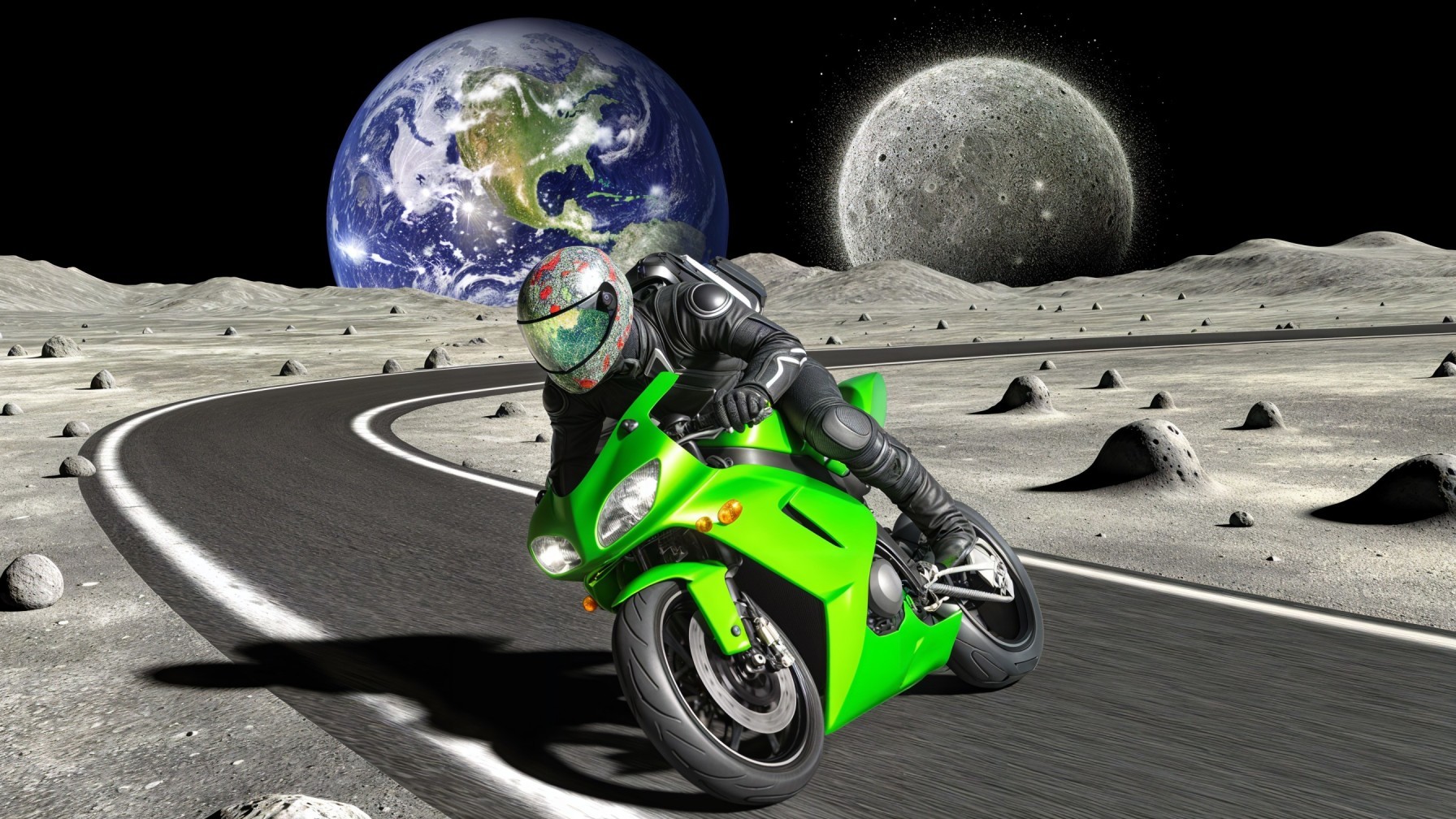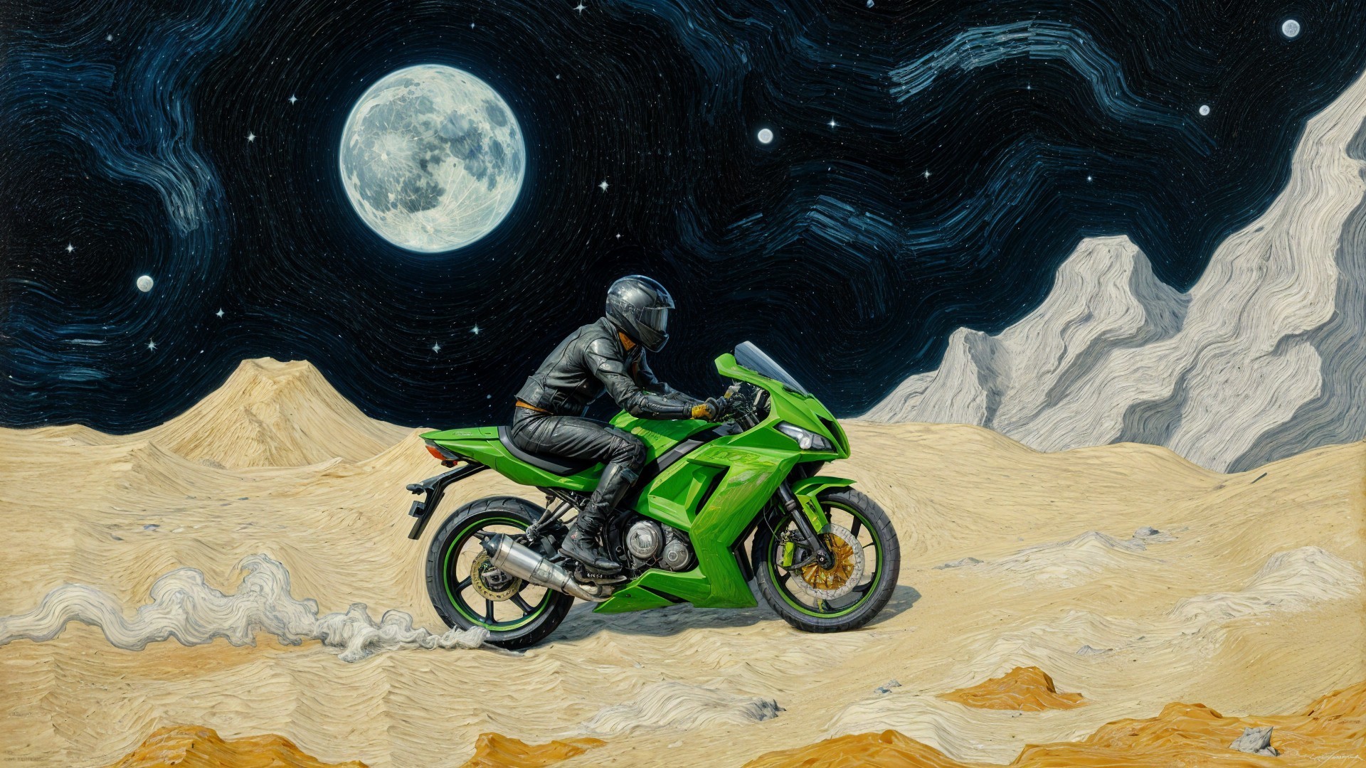 A motorcyclist in black riding a green bike through a swirling night sky with bright stars, set against mountains and a glowing full moon. It's a dynamic, imaginative blend.