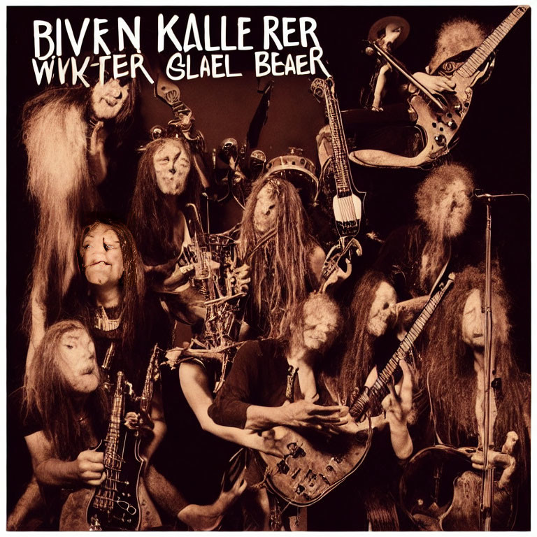 Band photo with distorted text overlay and instruments such as guitars and saxophone