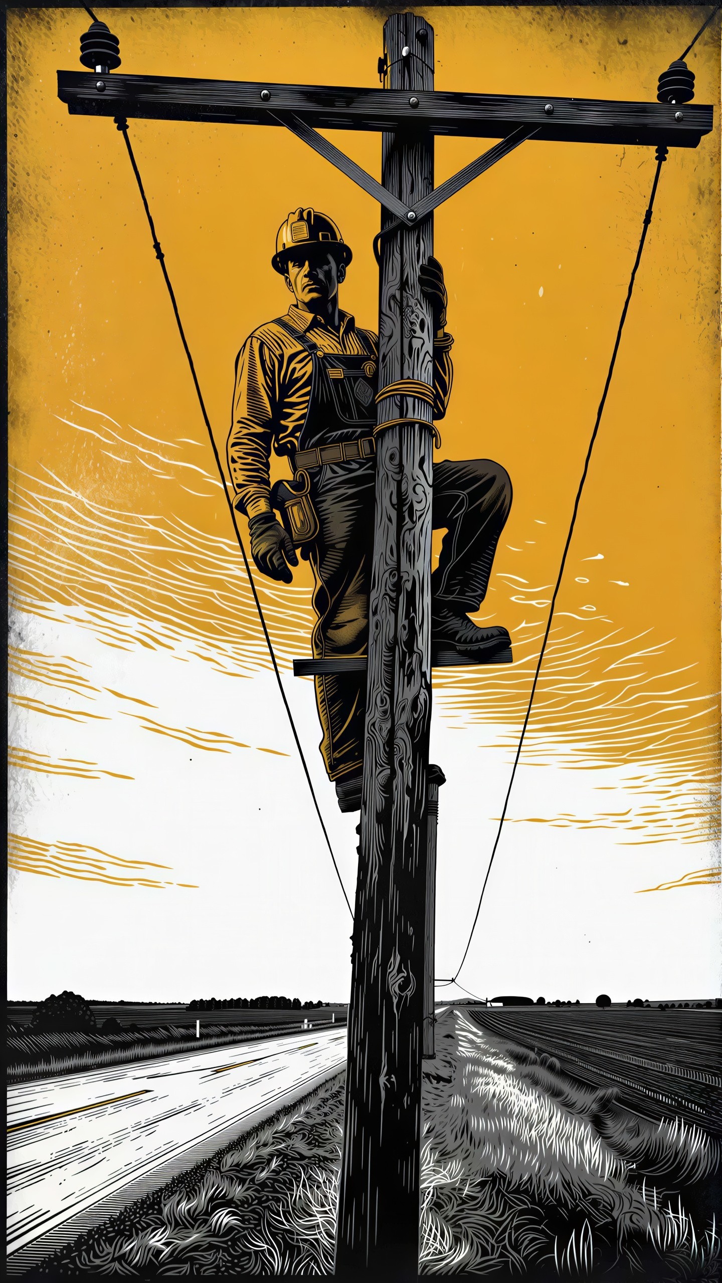 In a striking vector art illustration with a bold black outline, a male lineman wearing a hard hat, long-sleeved shirt, and overalls, is seen from the chest down, positioned on a dark wooden utility pole. He stands on a small rectangular platform attached to the pole, with his right foot