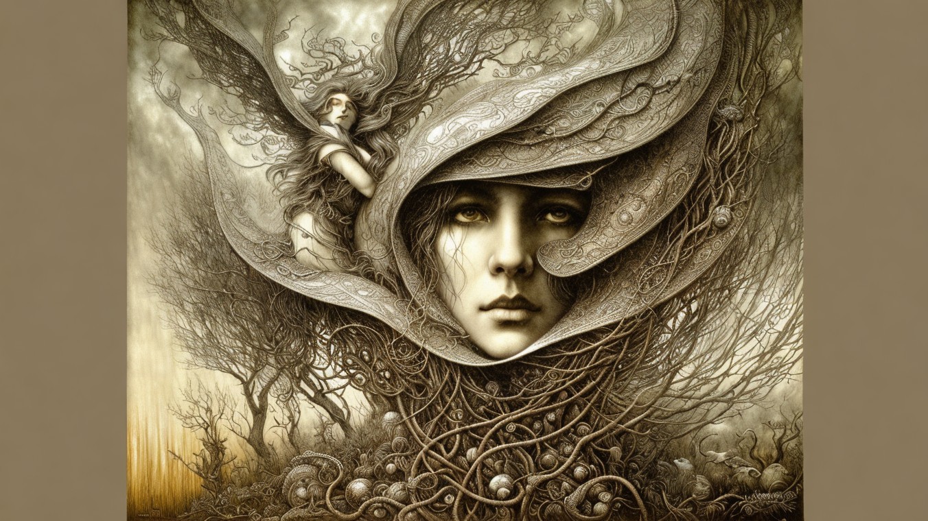 A woman with flowing hair stands against a backdrop of a large moon and barren trees. She wears a wide-brimmed hat, reflecting a blend of elegance and nature's wild beauty.