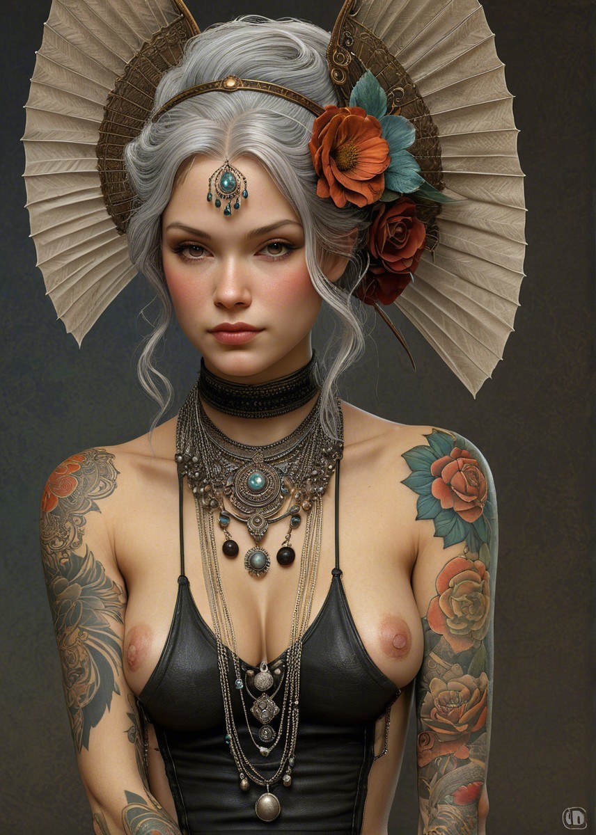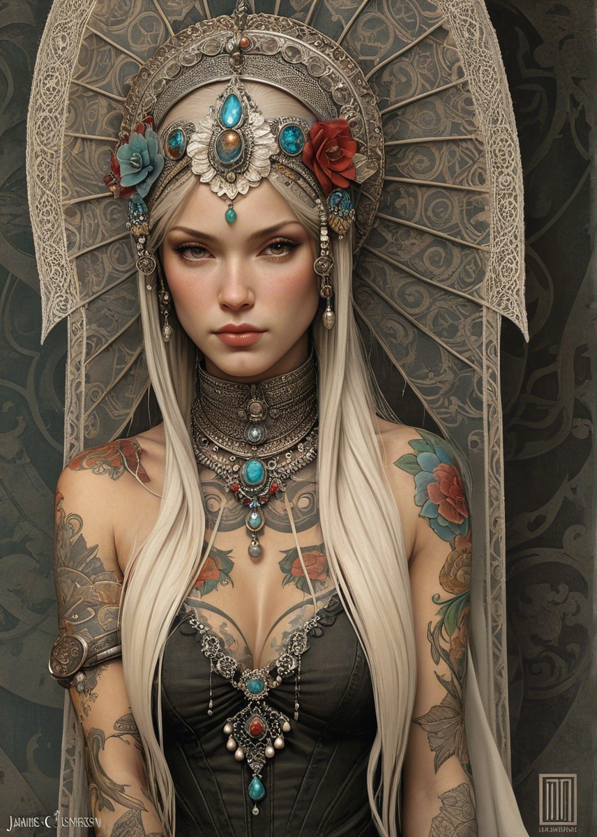 A striking woman with blue hair and a vintage hat adorned with a rose. She wears elaborate jewelry, featuring turquoise and pearls, and showcases beautiful floral tattoos on her arms.