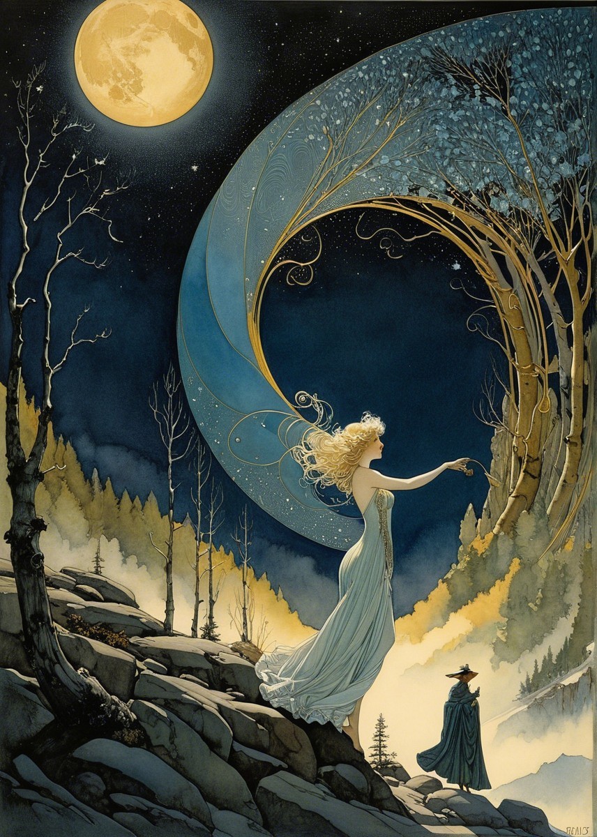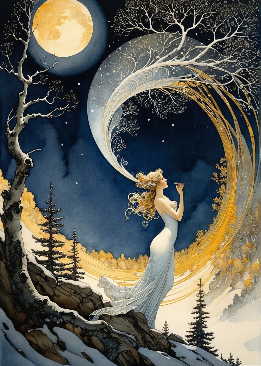 A mystical figure in a flowing gown dances under a full moon, surrounded by a starry night. Icy trees frame the scene, creating an enchanting winter landscape filled with magic.