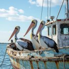 Three pelicans perch on the edge of a weathered fishing boat, surrounded by calm waters under a blue sky dotted with fluffy clouds. The scene captures a serene coastal moment.