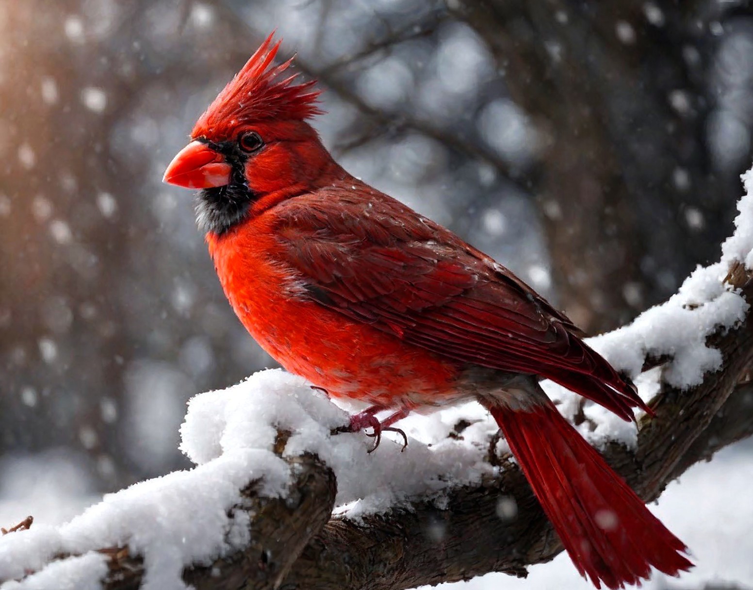 Vibrant red cardinal on snowy branch with falling snowflakes